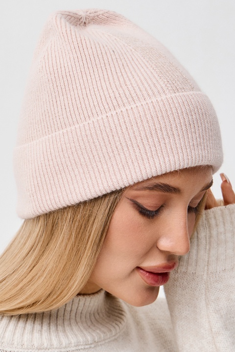 Шапка одинарная с отворотом, сзади на шве металл. декор. Вязка плотная и эластичная имеет мягкую текстуру. Размер: 56-58. Состав: 10% ангора, 50% вискоза, 25% нейлон, нить люрекса. Производство: Россия.