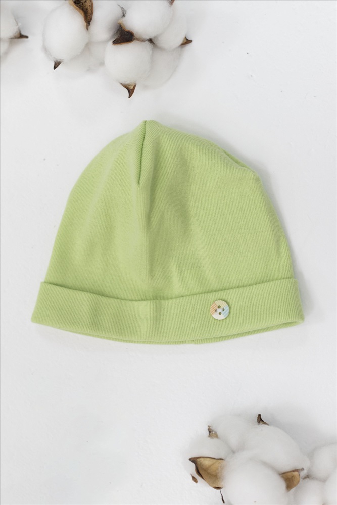 Сезон: Всесезонный Состав: Хлопок 100% Цвет Номенклатуры: фисташковый Шапочка выполнена из хлопкового полотна, с отворотом и пуговицей сбоку. Комментарии к товару