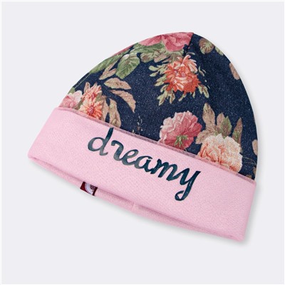 Эффектная шапочка, декорированная цветочным принтом, для девочки.