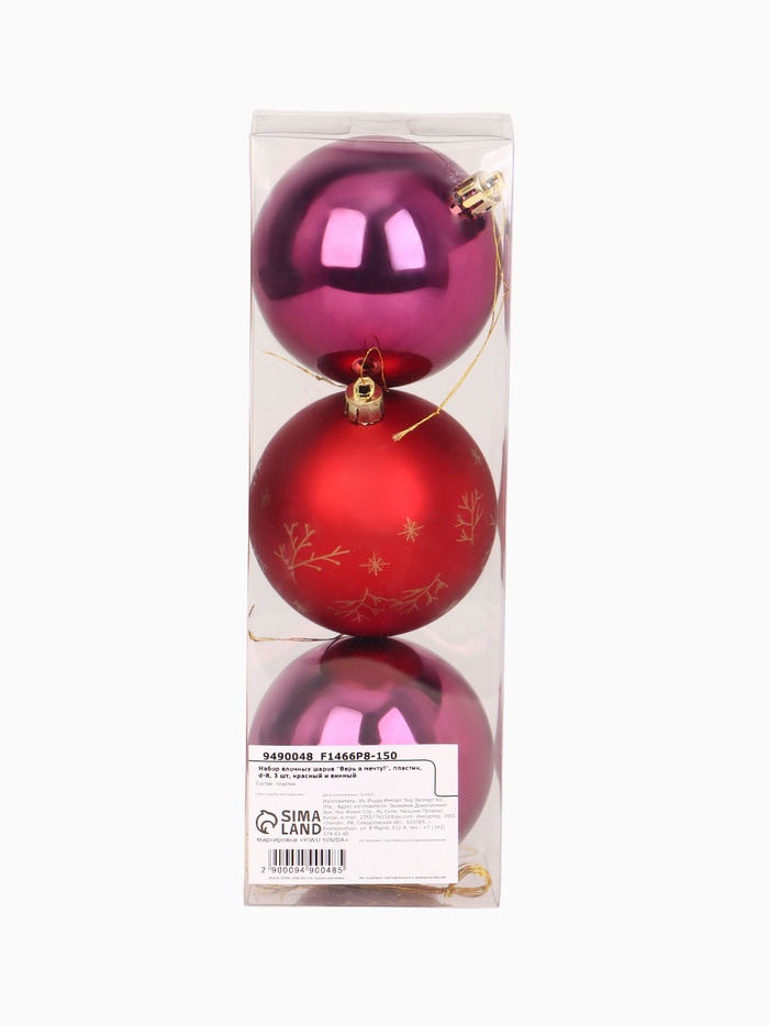 Габариты: 24 x 8 x 8 Страна: Китай В боксе: 60 набор Состав: Пластик Материалы: пластик Фасовка: по 1 набор Индивидуальная упаковка: Пластиковая коробка Габариты товара: 8 см × 8 см × 24 см Сертификат: Не подлежит сертификации Набор: Да Цвет: Красный, Розовый Высота, см: 24 В наборе, шт.: 3 Диаметр шара, см: 8 Символ года: Нет Тематика праздника: Новый год Материал: Пластик Стиль: Фьюжн Фиксированная цена: Да Комментарии к товару