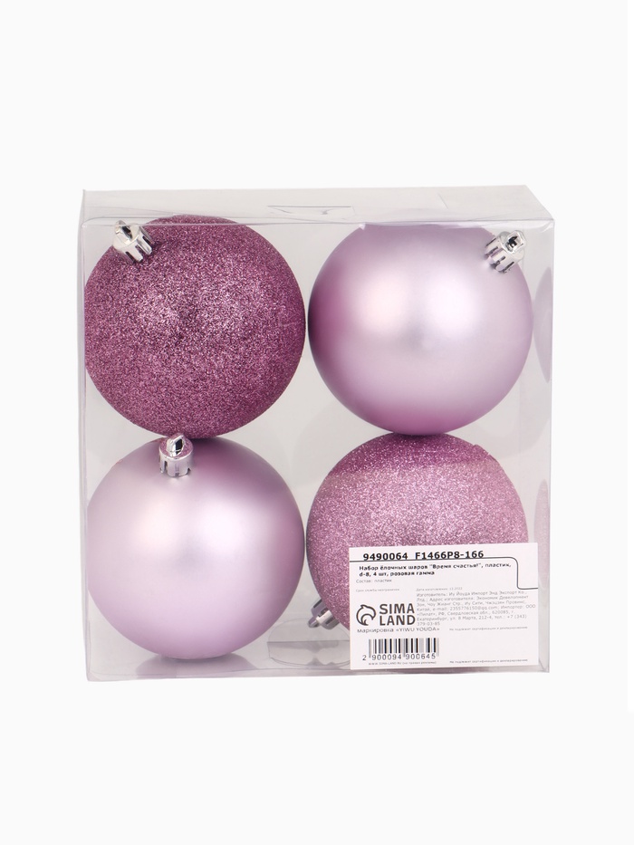 Габариты: 16 x 16 x 8 Страна: Китай В боксе: 45 набор Состав: Пластик Материалы: пластик Фасовка: по 1 набор Индивидуальная упаковка: Пластиковая коробка Габариты товара: 16 см × 8 см × 16 см Сертификат: Не подлежит сертификации Набор: Да Цвет: Розовый Высота, см: 16 В наборе, шт.: 4 Диаметр шара, см: 8 Символ года: Нет Тематика праздника: Новый год Материал: Пластик Стиль: Фьюжн Фиксированная цена: Да Комментарии к товару