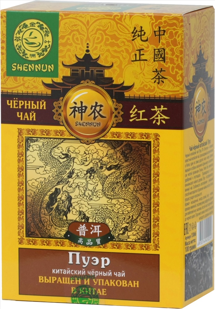Чай чёрный китайский крупнолистовой.Пуэр изготавливается из крупного чайного листа. Он повышает работоспособность, способствует легкому пищеварению, выводит токсины, нормализует обмен веществ, способен убирать лишний вес и омолаживать организм. Вкус, цвет и аромат отличаются нотками сухофруктов. Для того, чтобы получить не очень крепкий настой, пуэр стоитзаваривать не более 30 секунд. Заваривая пуэр 3-5 минут, он становится более насыщенным, густым и очень крепким. Послевкусие тёплое длительное.