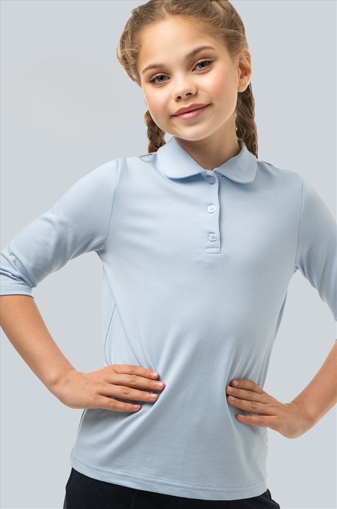 Элегантное школьное поло для девочки – баланс классики и расслабленности! Голубая блузка выполнена из хлопкового трикотажа. Стильные детали кроя: отложной воротник, короткая планка на пуговицах, рукава 3/4.