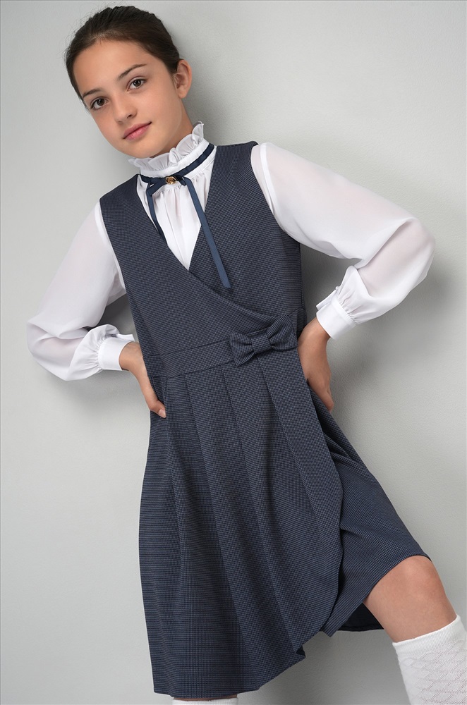 Яркий акцент детского подросткового гардероба — школьный сарафан с рисунком гусиная лапка синего цвета! Он сразу привлекает внимание своим элегантным и оригинальным дизайном. Жаккардовый сарафан для девочки подходит для повседневного использования и идеально впишется в образ для школы.