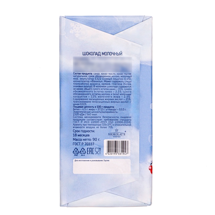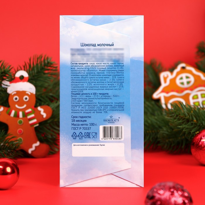 Габариты: 15,5 x 7,5 x 1 Страна: Россия В боксе: 26 шт Состав: См. на упаковке Материалы: см. на упаковке Фасовка: по 1 шт Индивидуальная упаковка: Цветная картонная коробка Сертификат: ЕАС Белки, г: 4,5 Жиры, г: 37 Углеводы, г: 53 Вес нетто, г: 100 Энергетическая ценность, ккал: 560 Тематика: Новогодняя Символ года: Нет Тематика праздника: Рождество, Новый год Форма: Плитка Вид шоколада: Молочный Добавки: Без добавок Фиксированная цена: Да "Магия новогоднего шоколада" - это не просто сладость, это настоящий волшебный подарок, который принесет радость и удовольствие в самые долгожданные моменты праздничного сезона. Этот шоколадный шедевр создан с любовью и заботой, чтобы погрузить вас в атмосферу новогодней сказки. Нежная шоколадная плитка словно скрывает в себе тайны вкусов и ароматов. Подарите себе и своим близким нежную шоколадную плитку и создайте моменты настоящей радости и волшебства. Пусть каждый кусочек этого шоколада пожарит вам улыбку, уют и незабываемые впечатления в этот волшебный сезон! Комментарии к товару