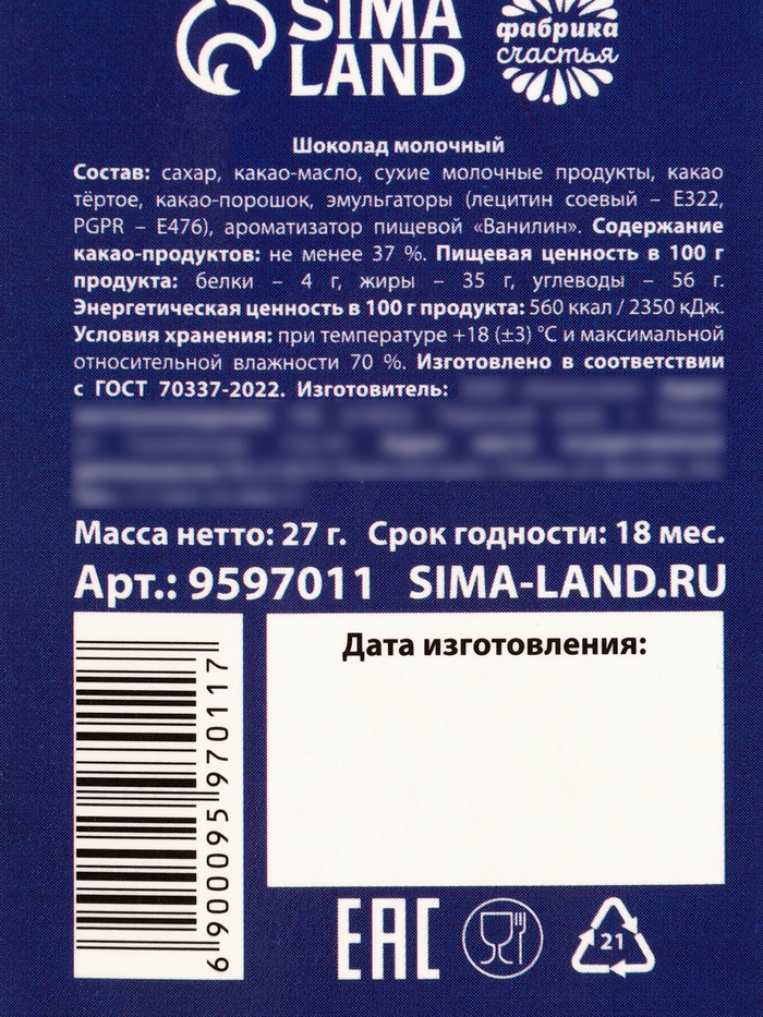 Состав: сахар, какао-масло, сухие молочные продукты, какао тёртое, какао порошок, эмульгаторы (лецитин соевый Е322, PGPR - Е476), ароматизатор, идентичный натуральному, "Ванилин".