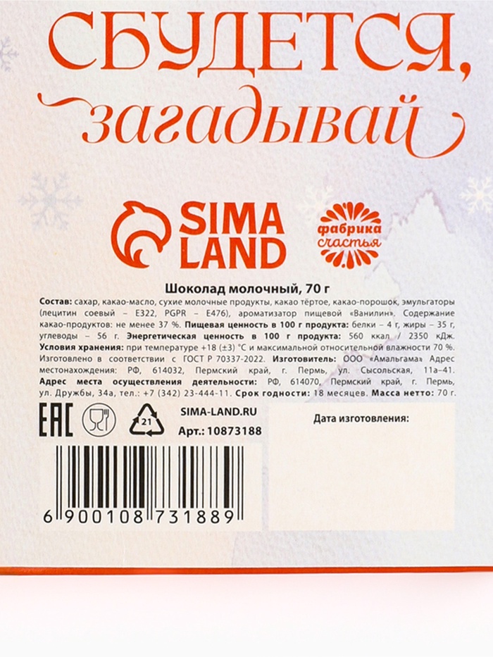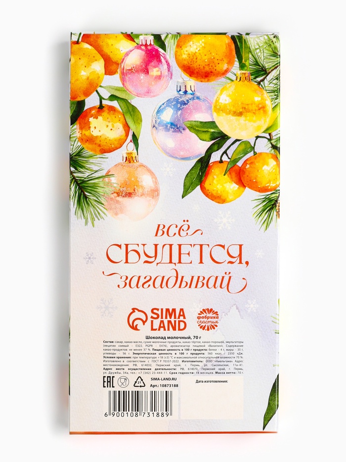 Производитель: Фабрика счастья Габариты: 17,5 x 9,5 x 1 Страна: Россия В боксе: 100 шт Состав: См. на упаковке Материалы: см. на упаковке Фасовка: по 1 шт Индивидуальная упаковка: Пакет (БОПП, полиэтилен, ПВХ, дой-пак) Сертификат: ЕАС Набор: Нет Белки, г: 4 Жиры, г: 35 Углеводы, г: 56 Вес нетто, г: 70 Энергетическая ценность, ккал: 560 Символ года: Нет Тематика праздника: Новый год Форма: Плитка Вид шоколада: Молочный