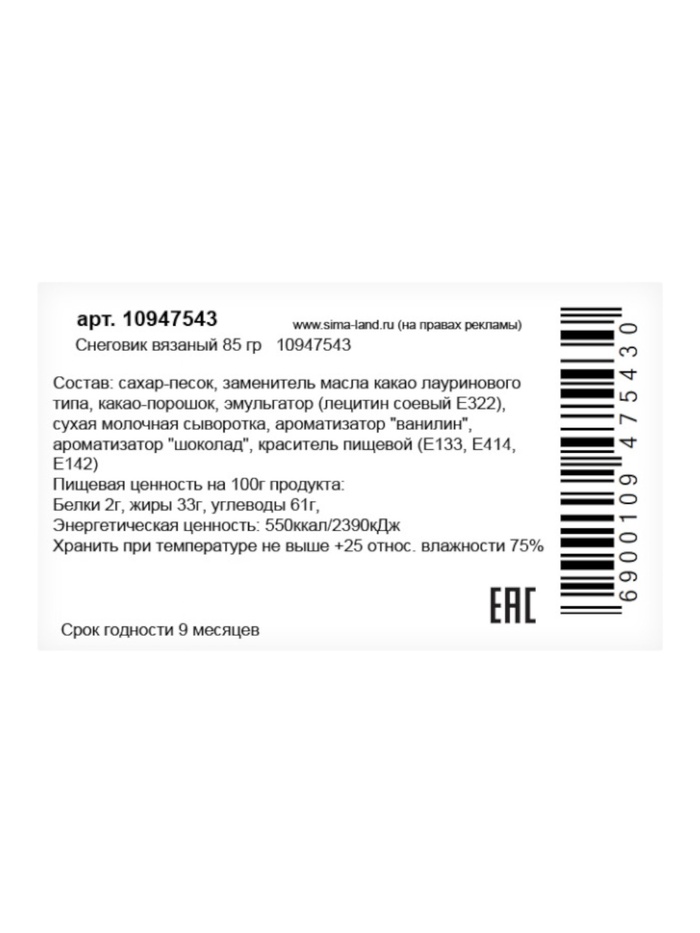 Страна: Россия В боксе: 120 шт Состав: См. на упаковке Материалы: см. на упаковке Фасовка: по 1 шт Индивидуальная упаковка: Цветная картонная коробка Сертификат: ЕАС Белки, г: 2 Жиры, г: 33 Углеводы, г: 61 Вес нетто, г: 85 Энергетическая ценность, ккал: 550 Символ года: Нет Тематика праздника: Новый год, Рождество Форма: Фигурка Вид шоколада: Кондитерская глазурь Добавки: С ванилью Фиксированная цена: Да Зимний друг в шоколадном свитере! Шоколадный снеговик в вязаном узоре, 85 г — это уютное лакомство из кондитерской глазури, которое воплощает образ самого доброго зимнего героя. Фигурка с фактурным рельефом создает ощущение тепла и рукотворности даже в сладком формате.