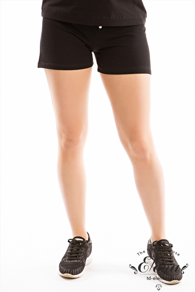 Женские шорты выполнены из футер петли ярких расцветок. Силуэт облегающий, пояс широкий со шнурком. Без карманов.