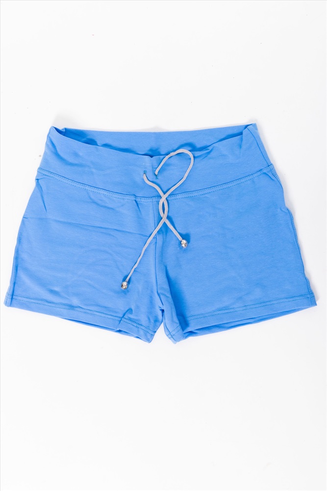 Женские шорты выполнены из футер петли ярких расцветок. Силуэт облегающий, пояс широкий со шнурком. Без карманов.