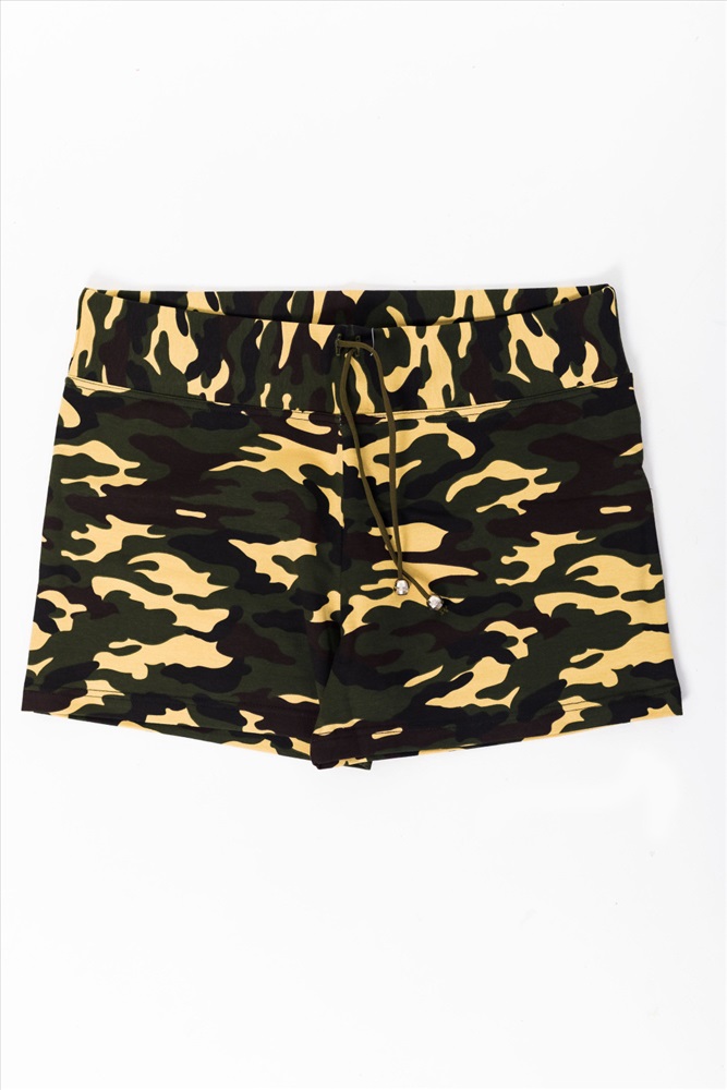 Женские шорты выполнены из футер петли ярких расцветок. Силуэт облегающий, пояс широкий со шнурком. Без карманов.