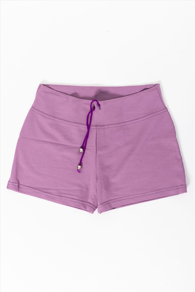 Женские шорты выполнены из футер петли ярких расцветок. Силуэт облегающий, пояс широкий со шнурком. Без карманов.