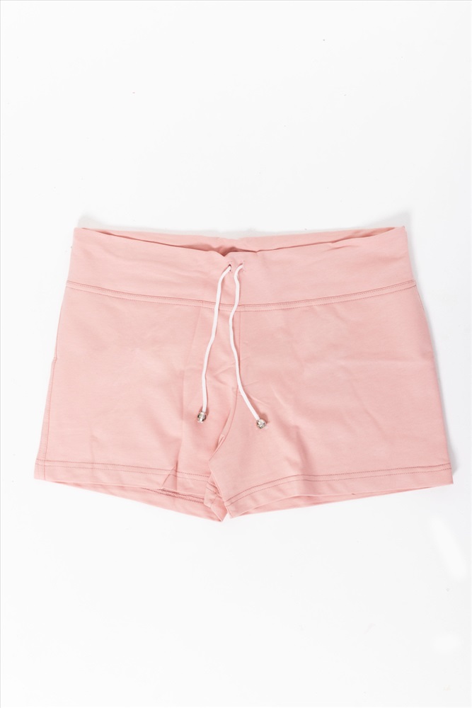 Женские шорты выполнены из футер петли ярких расцветок. Силуэт облегающий, пояс широкий со шнурком. Без карманов.