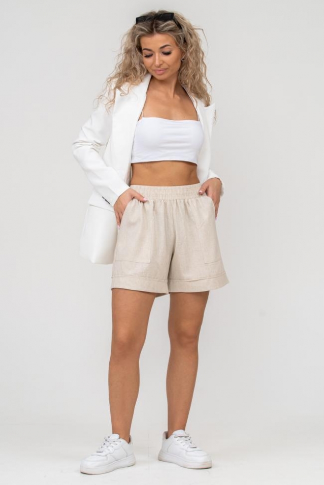 Стильные женские шорты из материала, в состав которого входит лён, незаменимая базовая вещь в гардеробе каждой женщины, девушки, девочки подростка. Это экологичный материал, обладающий отличной гигроскопичностью и воздухопроницаемостью. Пояс шорт выполнен на специализированной поясной машине. Это качественная обработка, при которой ваш пояс держит форму, не деформируется со временем и не даёт резинке скрутиться. Спереди шорт настрочены два вместительных накладных кармана, а по низу два отстроченных манжета. Шорты женские летние с карманами универсальны и практичны. Изделие такого плана вы можете использовать для похода на пляж, для отдыха, путешествий или прогулок. Для работы женские шорты можно легко сочетать с рубашкой или пиджаком. Создавайте различные образы с высоким каблуком на вечеринку или с обувью на сплошной подошве для прогулок по городу. Натуральная гипоаллергенная дышащая льняная ткань приятна и комфортна для тела, поэтому наши шортики идеальны для ежедневного ношения в качестве домашней одежды. За счёт свободного прямого кроя и эластичной резинки на талии шорты хорошо садятся и подчёркивают стройность вашего силуэта. А также наша стильная и современная модель будет идеально смотреться на высоких, средних и невысоких. Шорты женские льняные с карманами непременно найдут своё место в гардеробной комнате и станут Вашим любимым выбором!