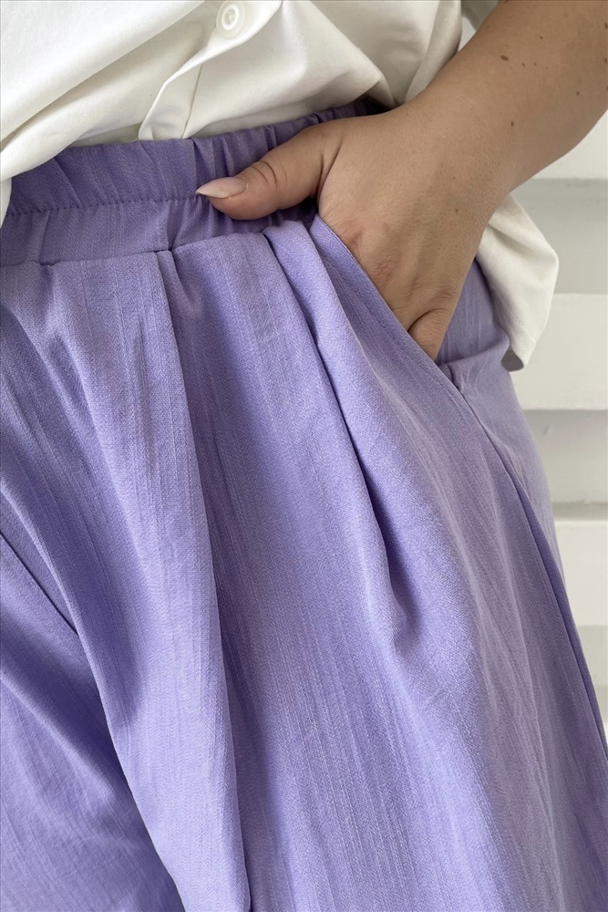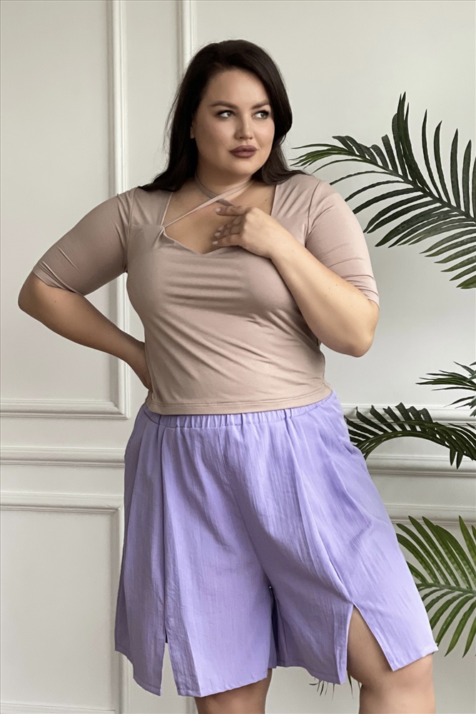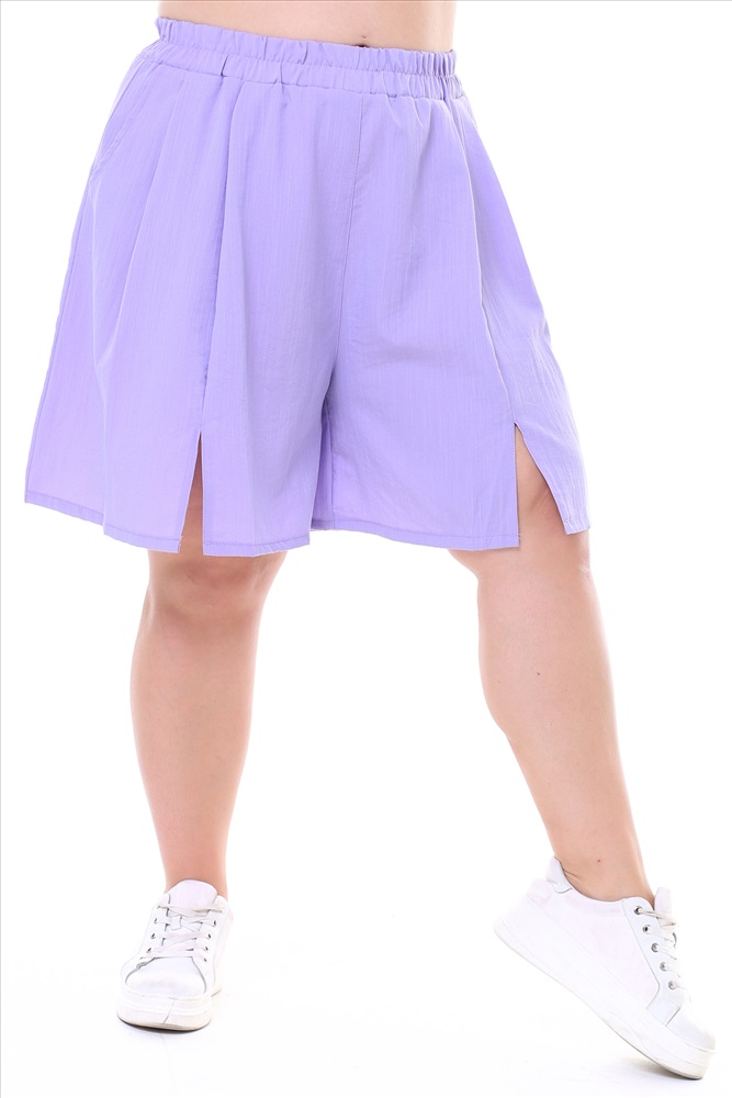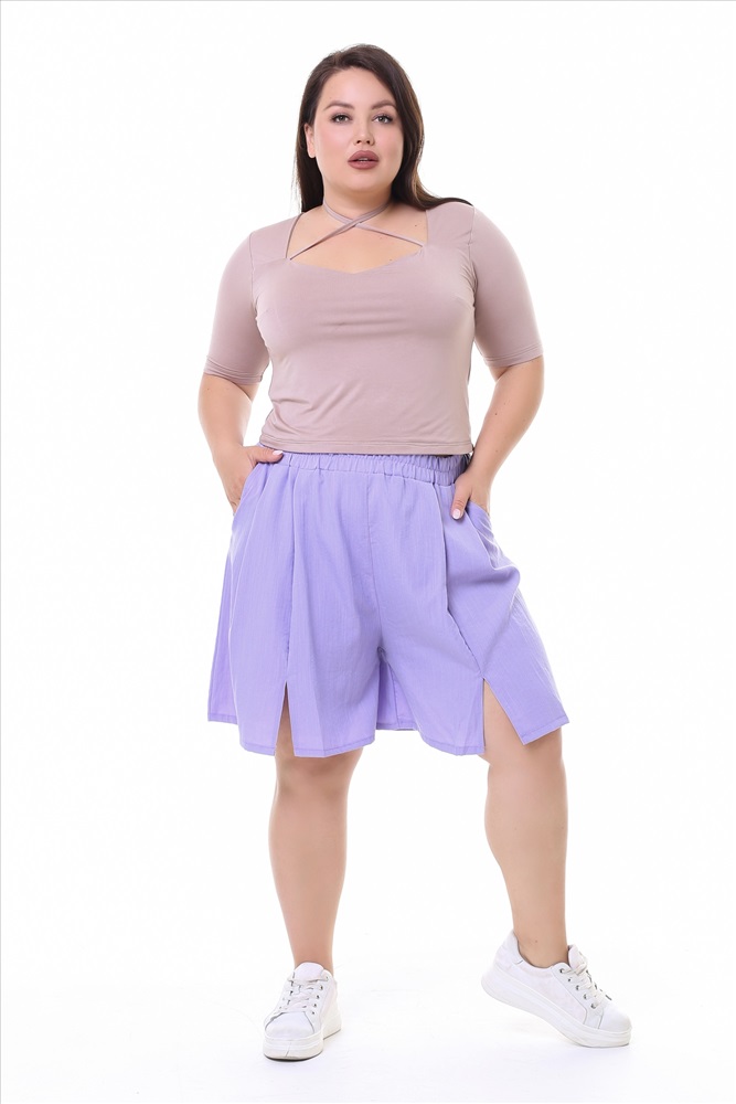 Шорты из мягкого струящегося материала отлично сидят за счет комфортной высокой посадки и эластичной резинки на поясе. Глубокие карманы по бокам добавляют практичности. Оригинальные складки по переду переходят в небольшие кокетливые разрезы, что добавляет женственности и романтизма. Модель не сковывает движений, прекрасно подчёркивает фигуру и привлекательно выглядит. Благодаря свободному крою создается ощущение комфорта, свободы и раскованности. Данная модель – идеальный вариант для прогулок и отдыха, уместный как в домашних, так и в городских образах. Эти шорты будут прекрасно смотреться с кроссовками, кедами и даже туфлями.