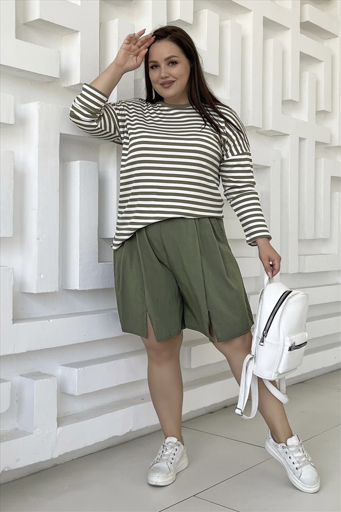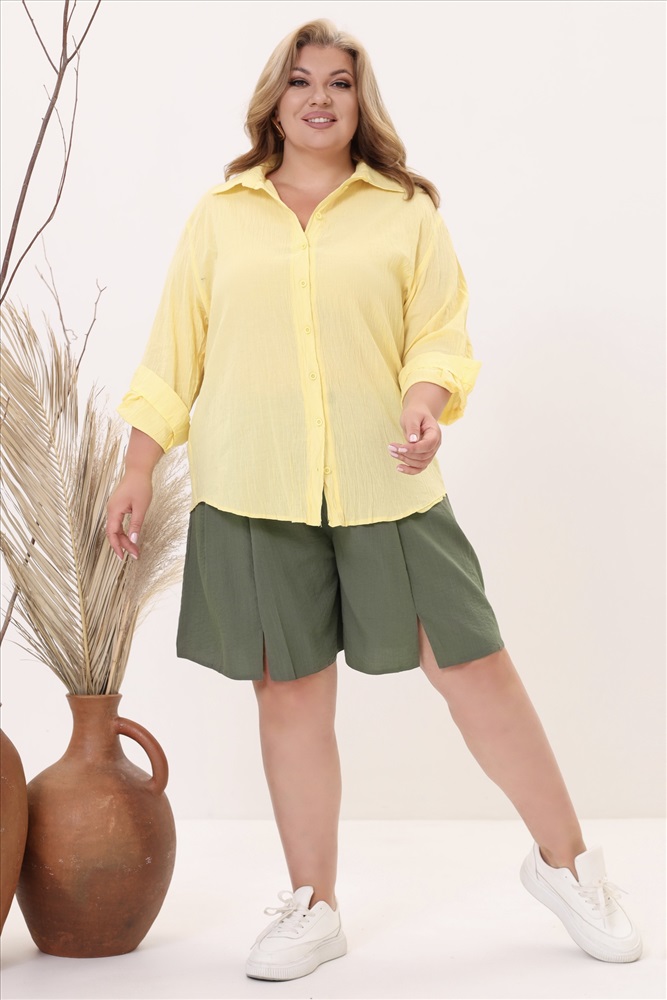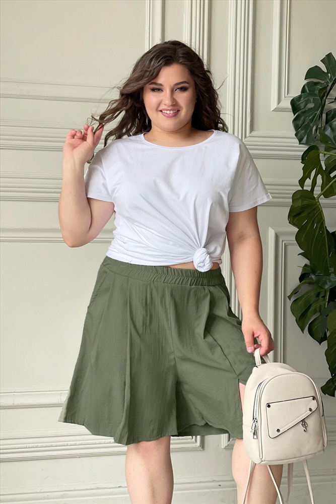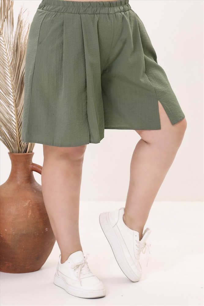 Шорты из мягкого струящегося материала отлично сидят за счет комфортной высокой посадки и эластичной резинки на поясе. Глубокие карманы по бокам добавляют практичности. Оригинальные складки по переду переходят в небольшие кокетливые разрезы, что добавляет женственности и романтизма. Модель не сковывает движений, прекрасно подчёркивает фигуру и привлекательно выглядит. Благодаря свободному крою создается ощущение комфорта, свободы и раскованности. Данная модель – идеальный вариант для прогулок и отдыха, уместный как в домашних, так и в городских образах. Эти шорты будут прекрасно смотреться с кроссовками, кедами и даже туфлями.