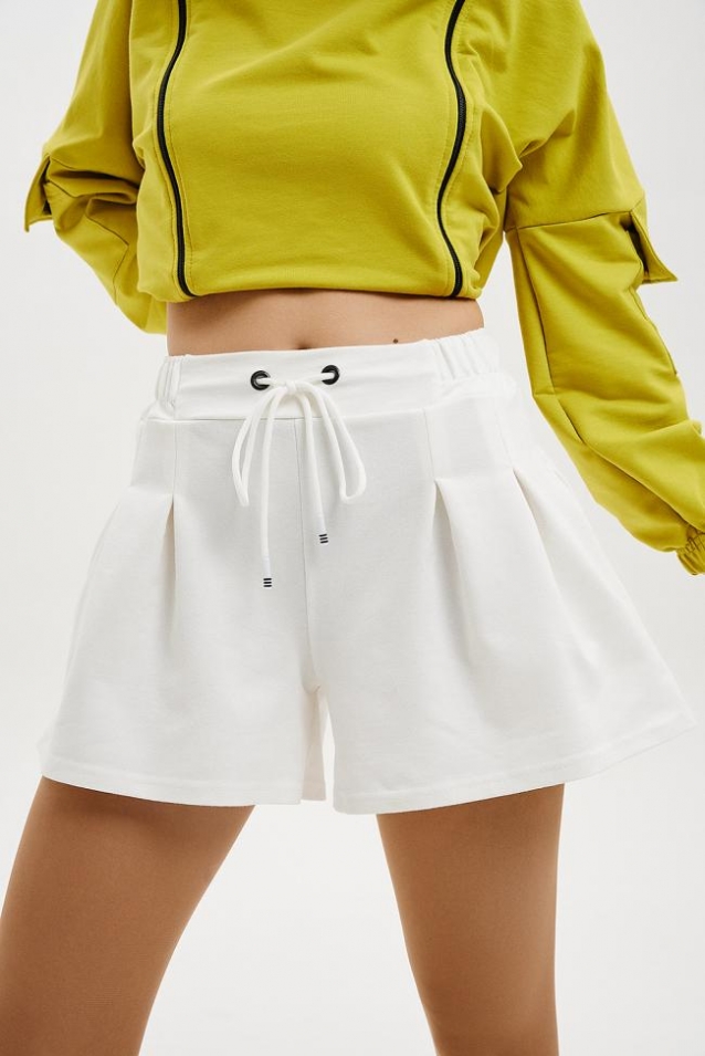 Стильные расклешенные шорты свободного кроя, на талии складки, пояс на резинке, удобные карманы в боковом шве и сзади.