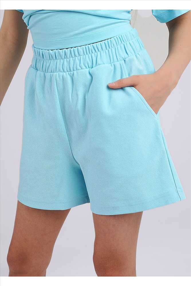 Шорты средней длины из эластичной джинсовой ткани. Для комфортной посадки пояс дополнен резинкой. Универсальная модель на каждый день, для удобства дополнена боковыми карманами.