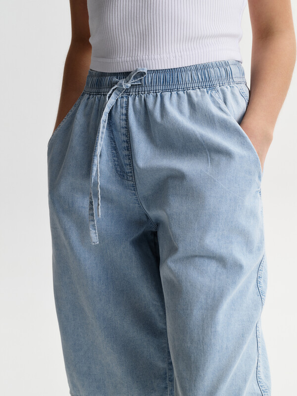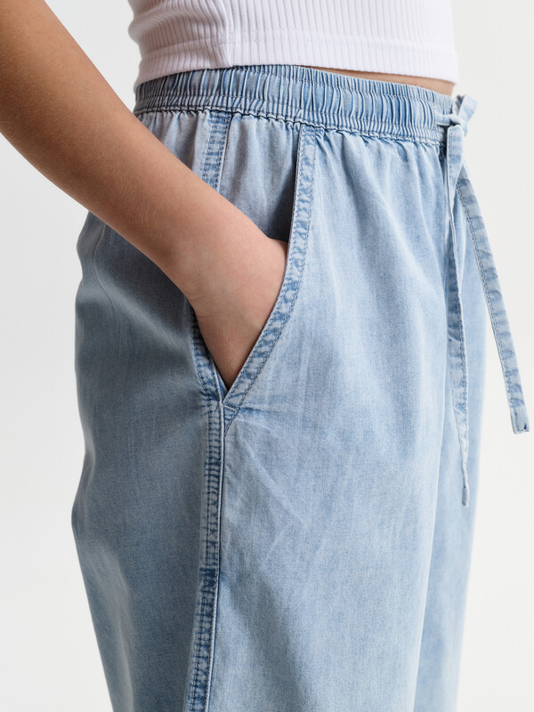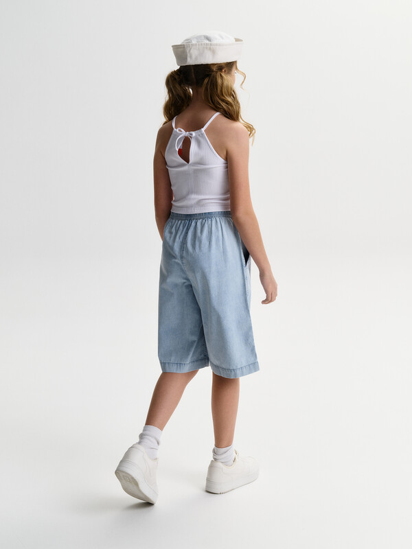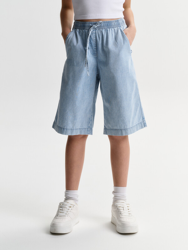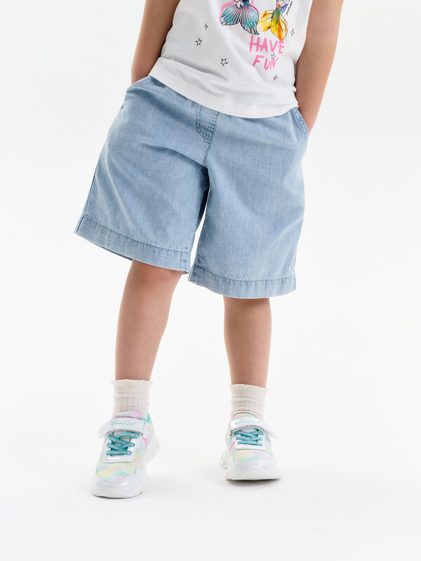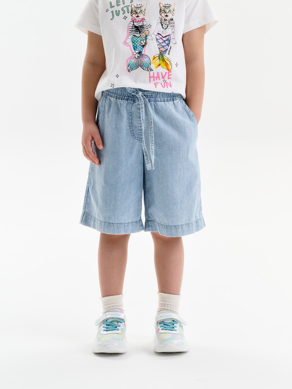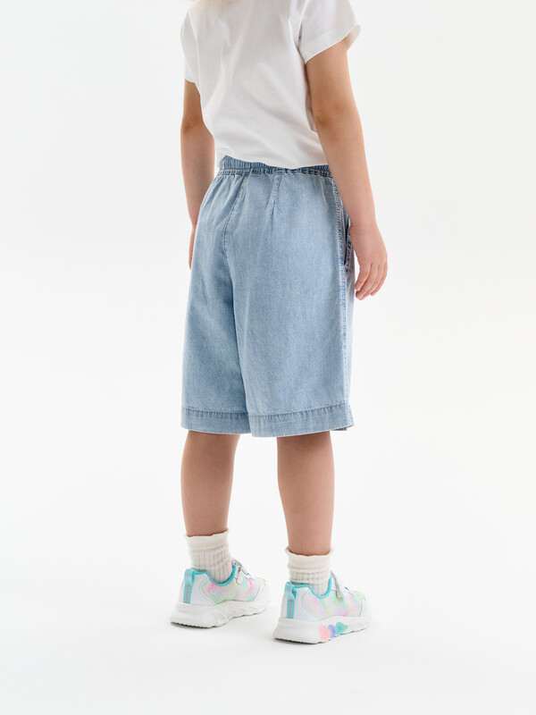 Шорты детские из тонкой джинсы для девочки. Широкие шорты длиной до колена подарят ребёнку комфорт и свободу движения. Модель без застёжки — быстро и удобно надевать и снимать. В поясе мягкая и широкая резинка — не давит и не перекручивается. Шнурок из основной ткани позволяет регулировать объём и посадку изделия. По центру переда имитация гульфика. По бокам удобные наклонные карманы. Шорты однотонные, без принта. За ними легко ухаживать. В составе ткани преобладает высококачественный хлопок — шорты мягкие и прекрасно пропускают воздух — кожа ребёнка дышит. Изделие выполнено в джинсовом синем цвете с актуальным эффектом мягкой варки garment wash. В линейке представлены следующие размеры: 3 (98); 4 (104); 5 (110); 6 (116); 7 (122); 8 (128); 9 (134); 10 (140); 11 (146). Подходят для девочек дошкольного и младшего школьного возраста, а также девочек-подростков. Шорты можно носить в детском саду, на прогулках, отдыхе и дома. Они прекрасно сочетаются с различными топами, джемперами, футболками. Джинсовые шорты для девочки — чудесный подарок сестре, дочери или внучке на любой праздник. Выбирайте нужный размер по таблице размеров на фото. Цвет товара на экране вашего устройства может отличаться от цвета изделия вживую.