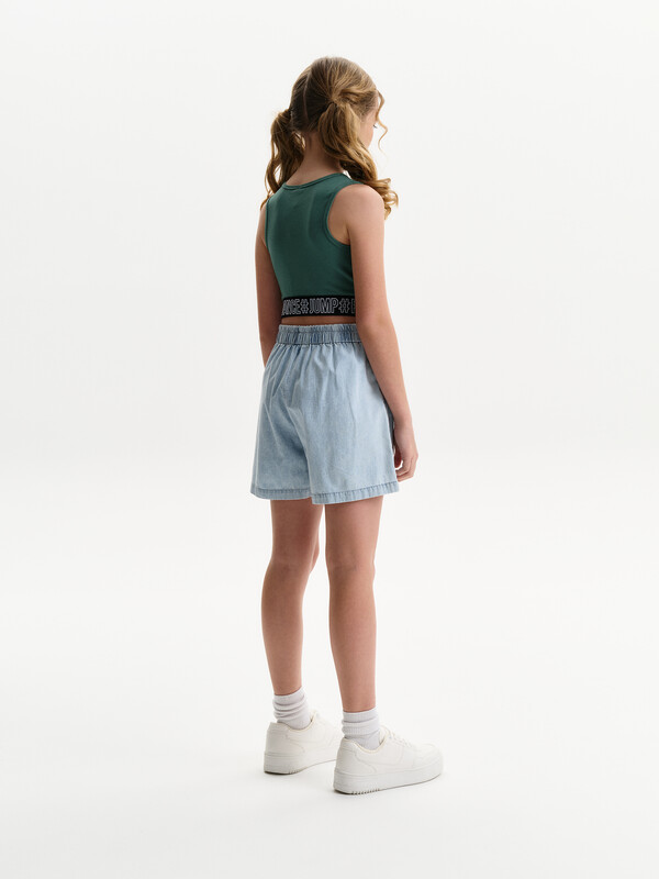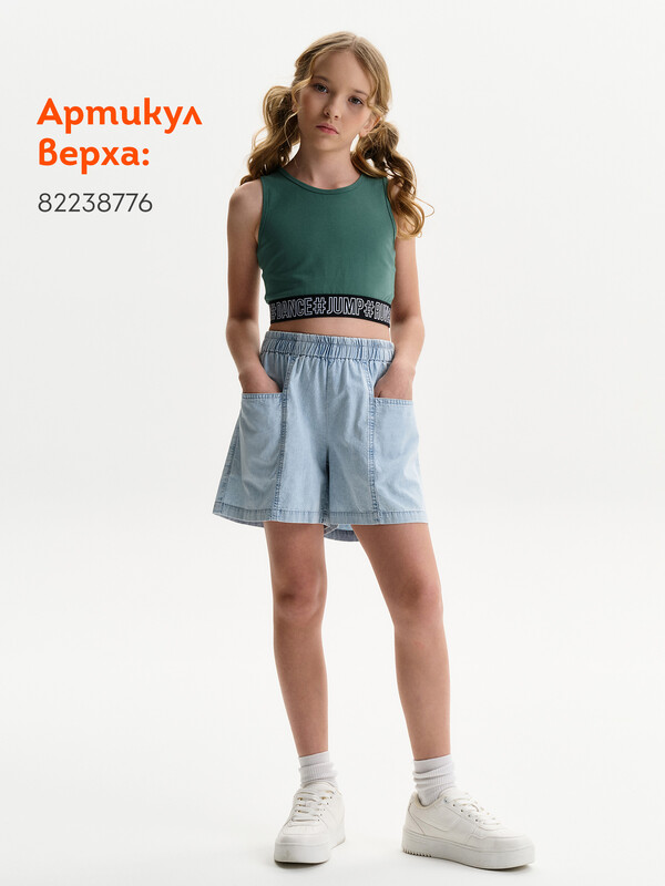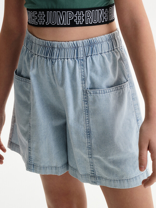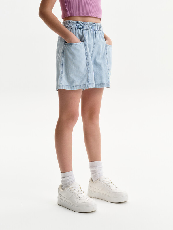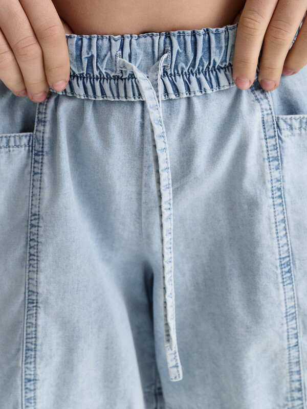 Новые джинсовые шорты из тонкой джинсы твилл. Короче чем в прошлом сезоне. Свободные легкие шорты для девочек с двумя карманами спереди и рельефными швами. Шорты без застежки-молнии, в поясе вставлена резина и дополнительно внутренний шнурок из основной ткани для регулировки. Сборка по талии достаточно большая, за счет чего достигается эффект короткой юбочки. Твил — это плотная и прочная хлопчатобумажная ткань саржевого (диагонального) переплетения, которая отличается характерными диагональными линиями на поверхности.
