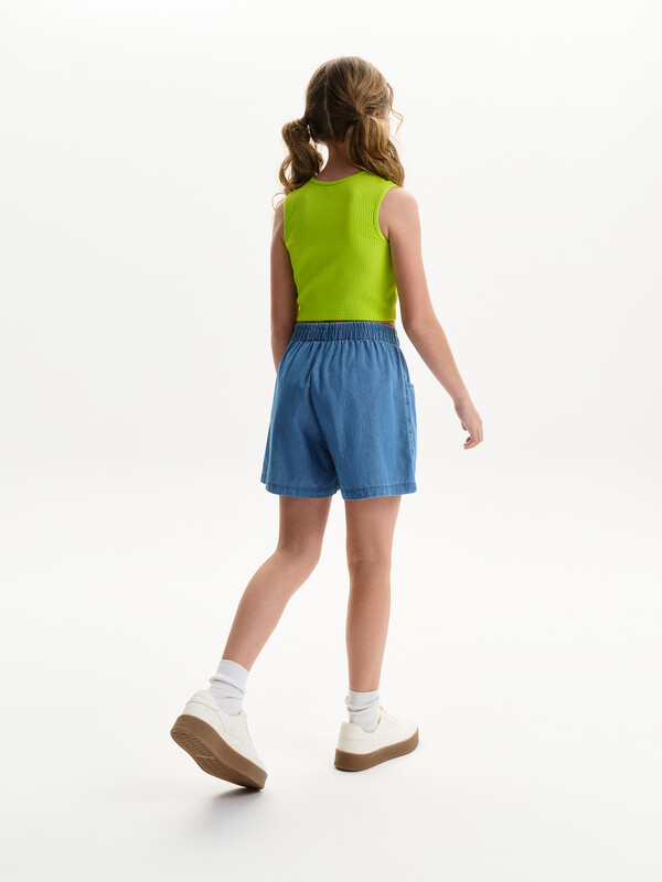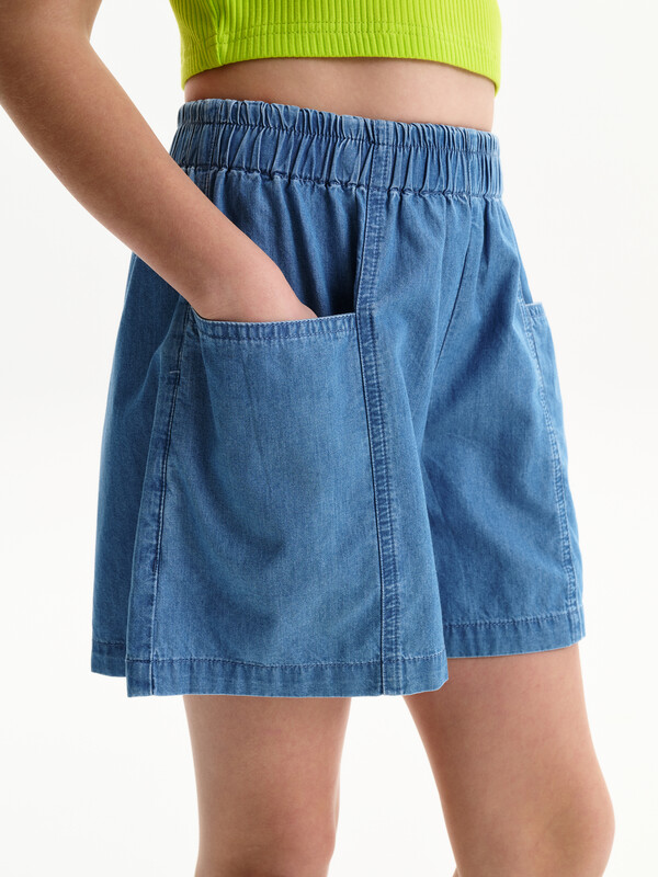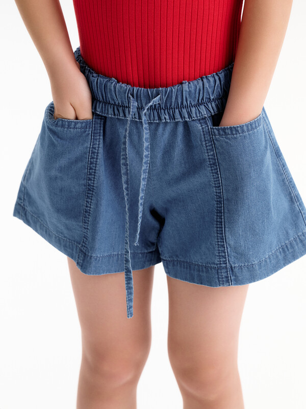 Новые джинсовые шорты из тонкой джинсы твилл. Короче чем в прошлом сезоне. Свободные легкие шорты для девочек с двумя карманами спереди и рельефными швами. Шорты без застежки-молнии, в поясе вставлена резина и дополнительно внутренний шнурок из основной ткани для регулировки. Сборка по талии достаточно большая, за счет чего достигается эффект короткой юбочки. Твил — это плотная и прочная хлопчатобумажная ткань саржевого (диагонального) переплетения, которая отличается характерными диагональными линиями на поверхности.