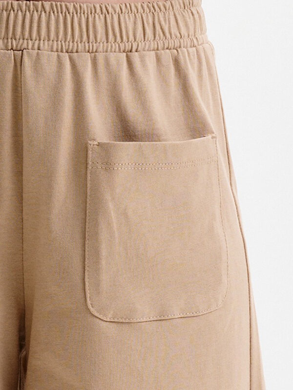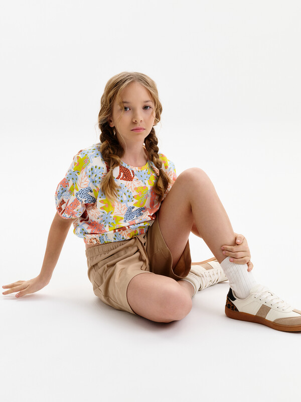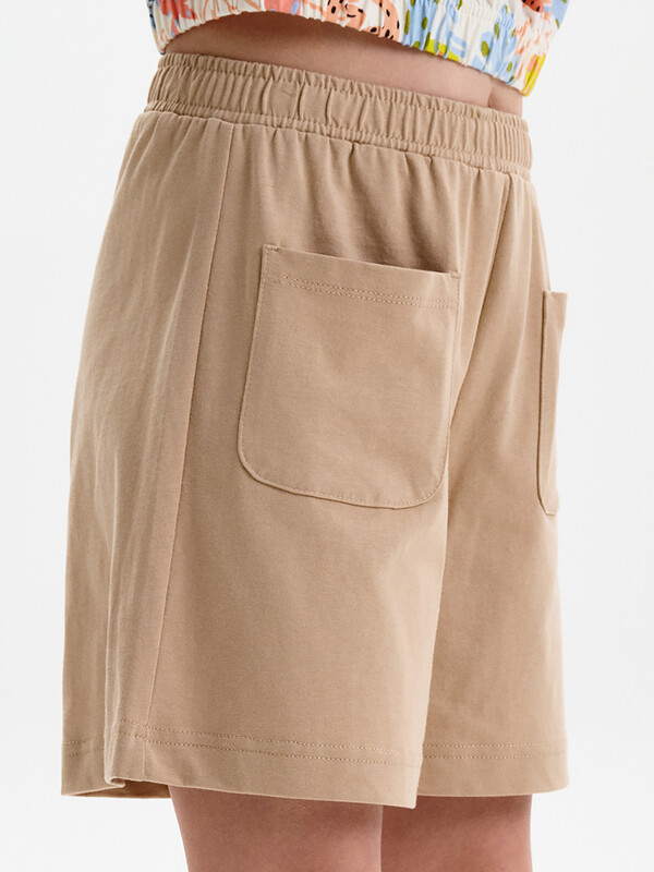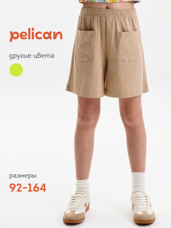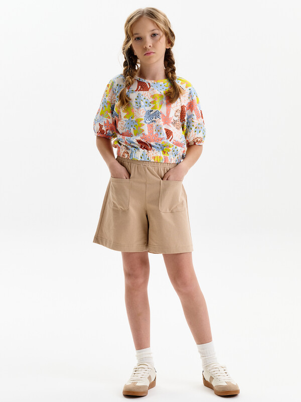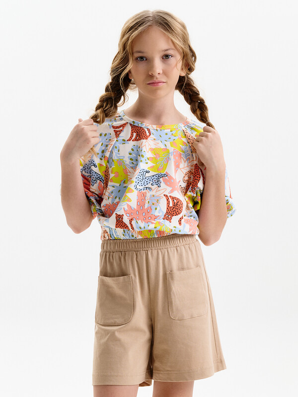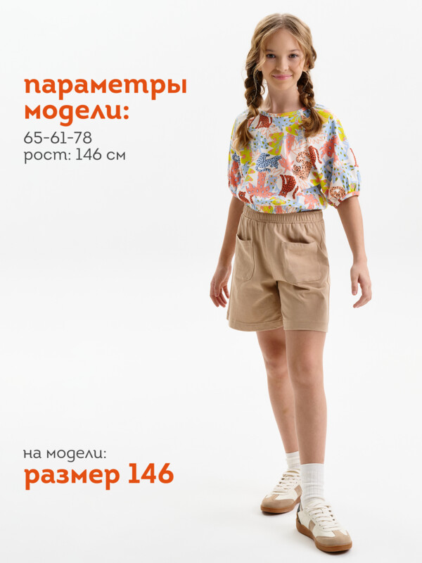 Шорты трикотажные для девочек из 100% хлопка. Длина уменьшена до середины бедра по сравнению с коллекцией Лето 25. Шорты с поясом на широком простроченном эластике и дополнительной шнуровкой обеспечивают идеальную посадку и регулировку по размеру.По переду два накладных кармана.
