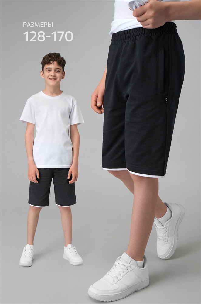 Преимущества: – хлопок (75%) в составе дарит комфорт и воздухопроницаемость; – прочный трикотаж с добавлением полиэстера держит форму и не деформируется; – пояс на резинке для удобной посадки и свободы движений; – карманы на молнии для надежного хранения мелочей; – низ с контрастной белой полосой создает стильный акцент. Детские шорты подойдут как для дома, так и на физкультуру или активный отдых. Прямой крой, базовый черный цвет и практичные детали делают их отличным выбором для подростка. Модель Кирилл, ее рост 147 см, параметры: 69-59-75 см. На нем размер 146.