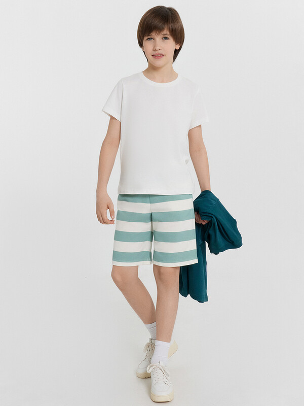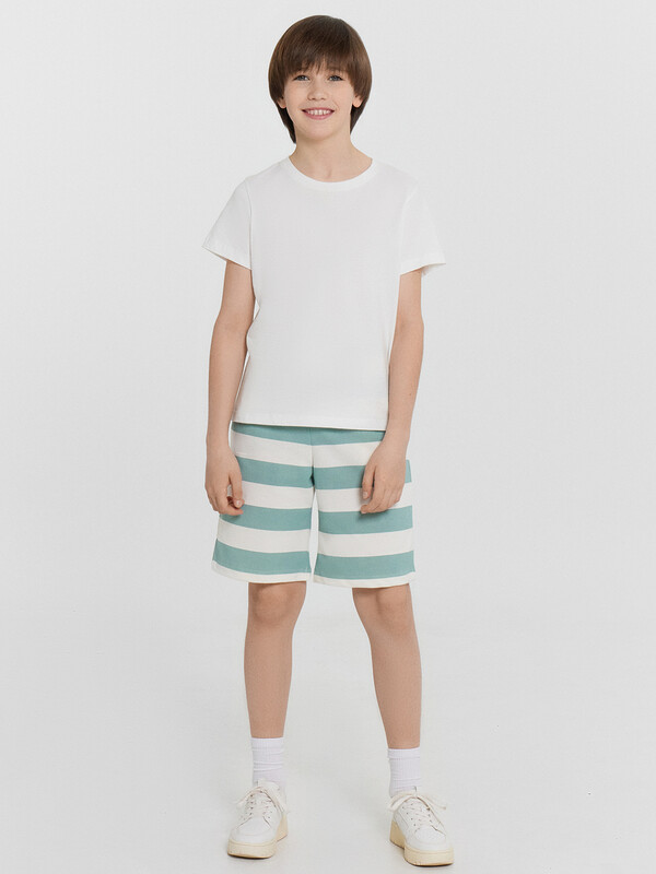 Шорты свободного силуэта для мальчиков. Пояс с эластичной тесьмой внутри и шнуром-завязкой с внутренней стороны. Есть удобные боковые карманы. Нижние срезы шортов подогнуты. Рекомендуем для спорта, дома и активного отдыха!