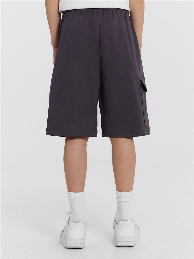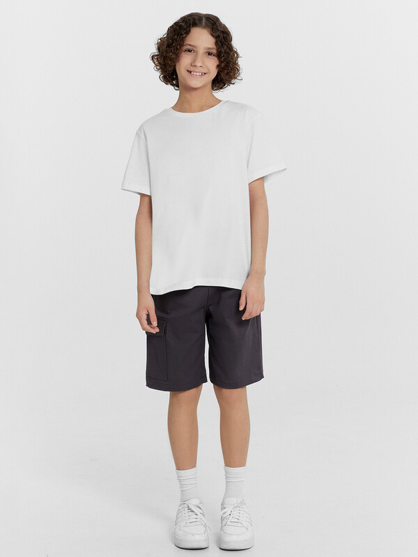 Шорты карго прямого силуэта из текстильного полотна. Посадка средняя. Длина выше колена. Пояс цельнокроеный с эластичной тесьмой и шнуром внутри. По поясу выполнены три декоративные строчки. На передних деталях брюк настрочен один карман с клапаном, обработаны карманы с наклонным входом от боковых швов. Низ изделия обработан швом в подгибку.