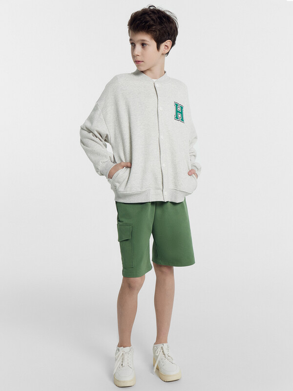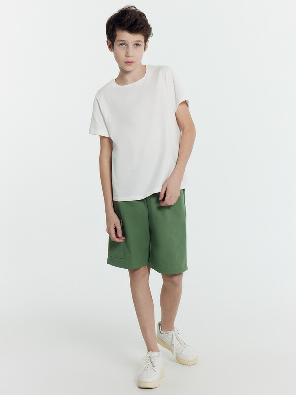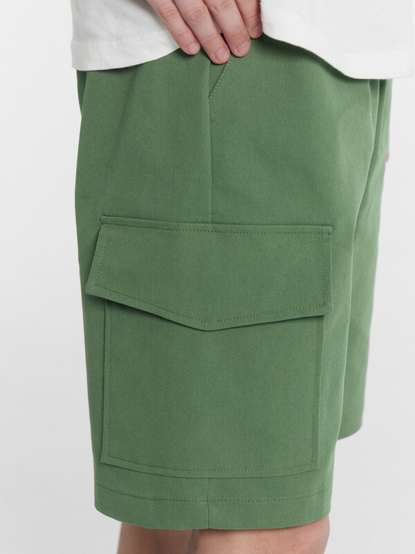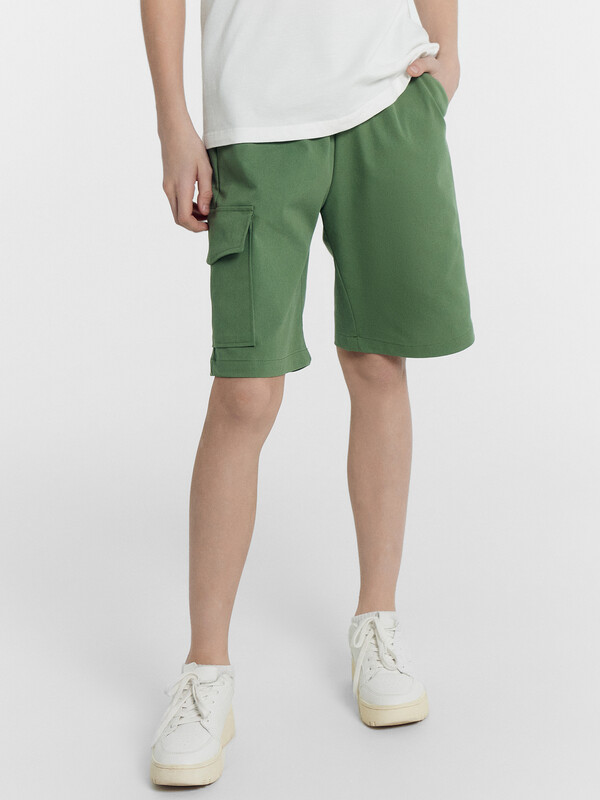 Шорты карго прямого силуэта из текстильного полотна. Посадка средняя. Длина выше колена. Пояс цельнокроеный с эластичной тесьмой и шнуром внутри. По поясу выполнены три декоративные строчки. На передних деталях брюк настрочен один карман с клапаном, обработаны карманы с наклонным входом от боковых швов. Низ изделия обработан швом в подгибку.