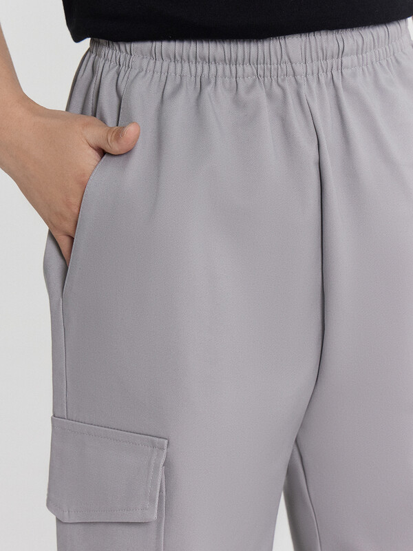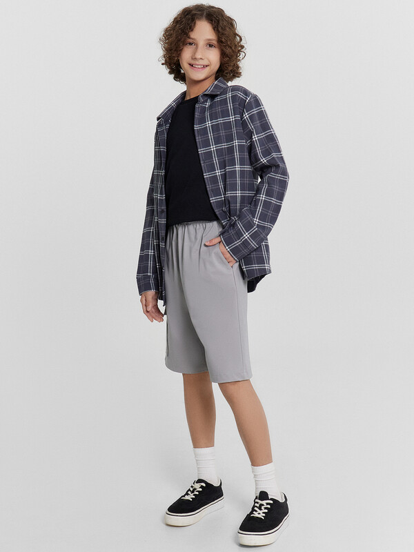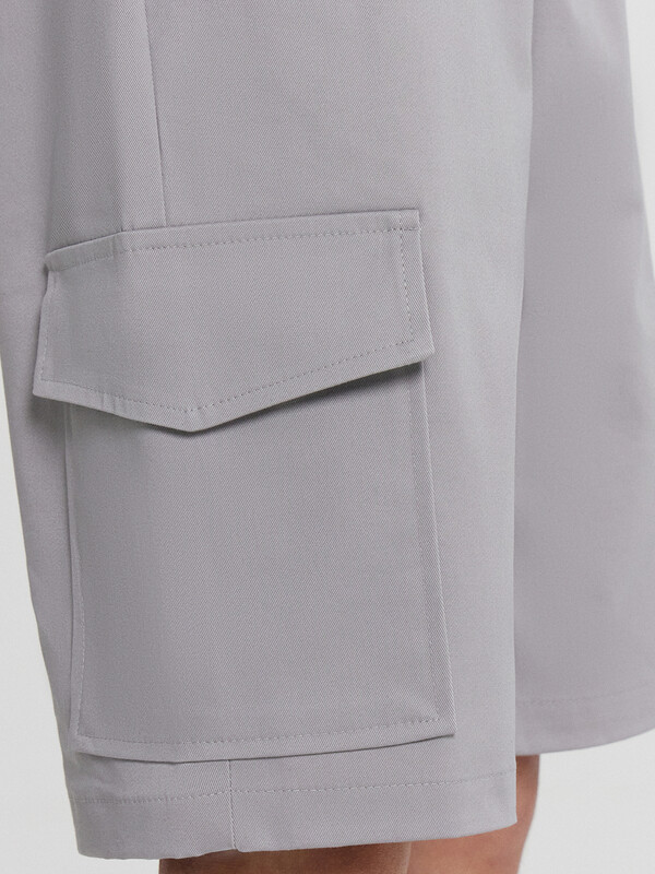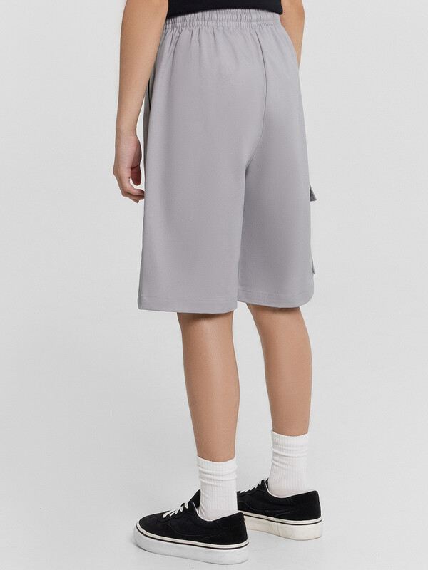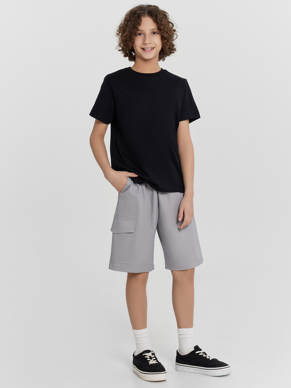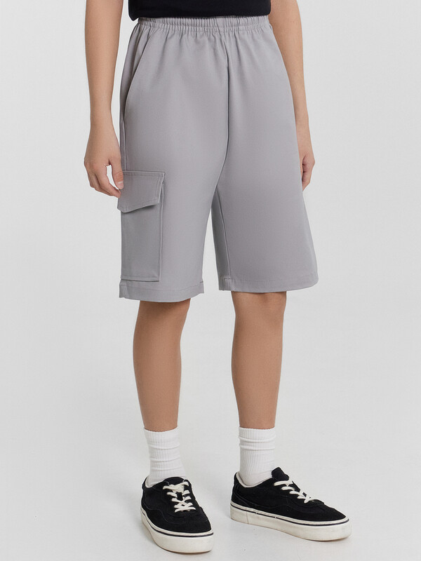 Шорты карго прямого силуэта из текстильного полотна. Посадка средняя. Длина выше колена. Пояс цельнокроеный с эластичной тесьмой и шнуром внутри. По поясу выполнены три декоративные строчки. На передних деталях брюк настрочен один карман с клапаном, обработаны карманы с наклонным входом от боковых швов. Низ изделия обработан швом в подгибку.