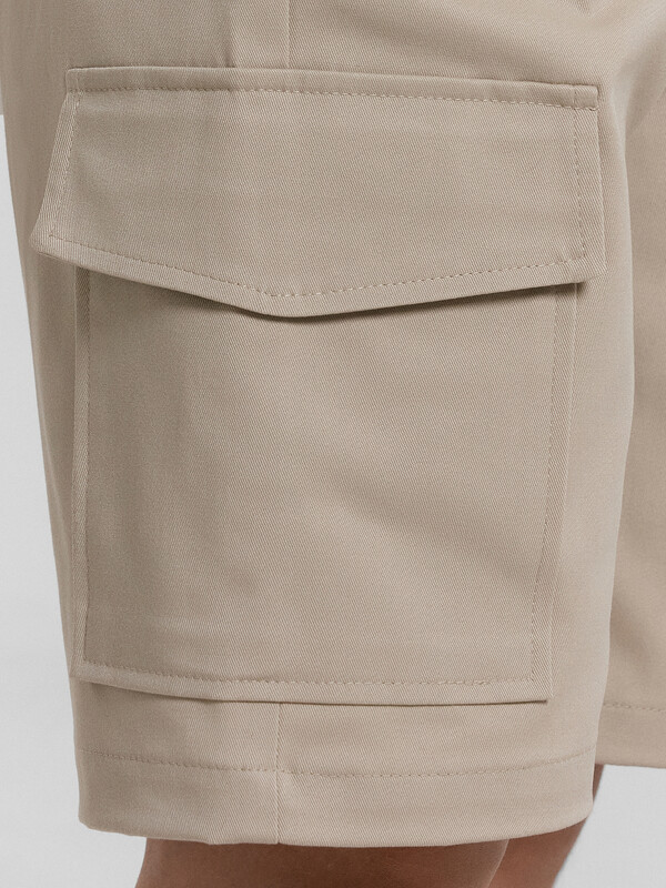 Производитель: Mark Formelle Шорты карго прямого силуэта из текстильного полотна. Посадка средняя. Длина выше колена. Пояс цельнокроеный  с эластичной тесьмой и шнуром внутри. По поясу выполнены три декоративные строчки. На передних деталях брюк настрочен один карман с клапаном, обработаны карманы с наклонным входом от боковых швов. Низ изделия обработан швом в подгибку.