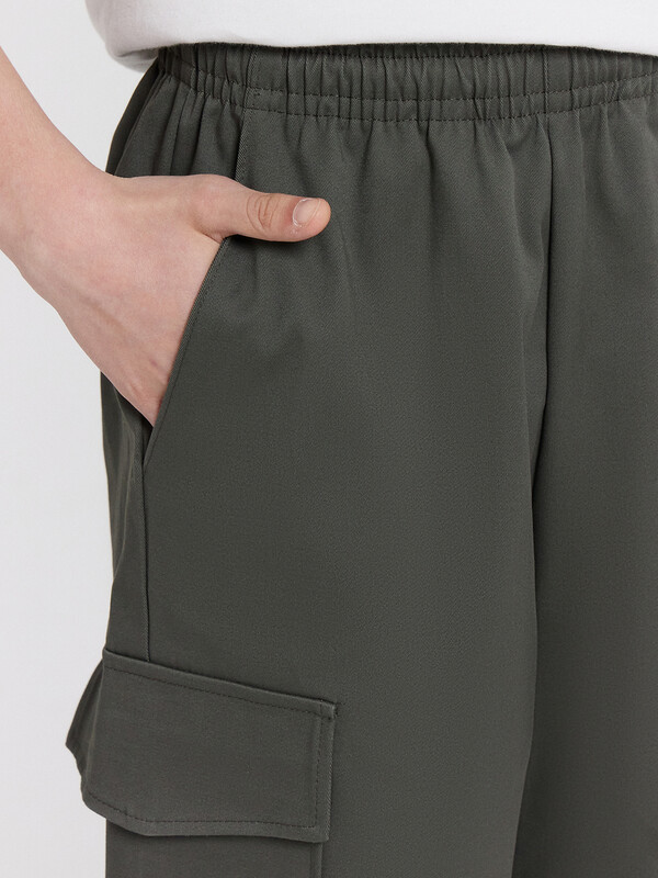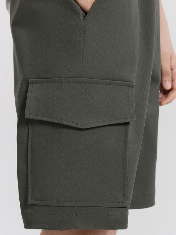 Производитель: Mark Formelle Шорты карго прямого силуэта из текстильного полотна. Посадка средняя. Длина выше колена. Пояс цельнокроеный  с эластичной тесьмой и шнуром внутри. По поясу выполнены три декоративные строчки. На передних деталях брюк настрочен один карман с клапаном, обработаны карманы с наклонным входом от боковых швов. Низ изделия обработан швом в подгибку.