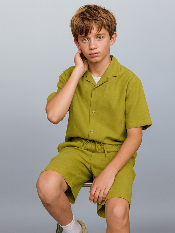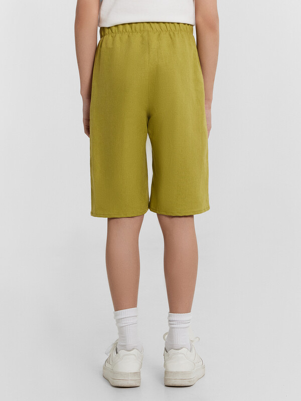 Шорты для мальчиков из ткани. Шорты с классической линией талии. Силуэт прямой. Пояс отрезной. Боковые швы перенесены вперед. Карманы в боковых швах. На внутренней стороне пояса пробиты петли, втянут шнур из основного полотна. Низ шорт обработан швом в подгибку.