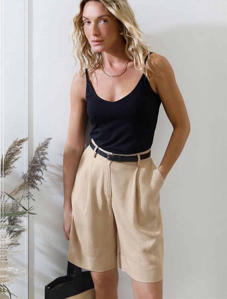 Состав: 70%Вис 30%Лен Шорты-бермуды выполнены изо льна с вискозой. Свободная модель с посадкой на талии. Ткань изящно струится, почти не мнется и сохраняет форму в течении долгого времени, обладает высокой воздухопроницаемостью. Идеальное решение в жаркий период. Подходит для любой фигуры и скрывает недостатки. Сочетается в костюме с топом D23.060 и блузками D29.237, D29.244