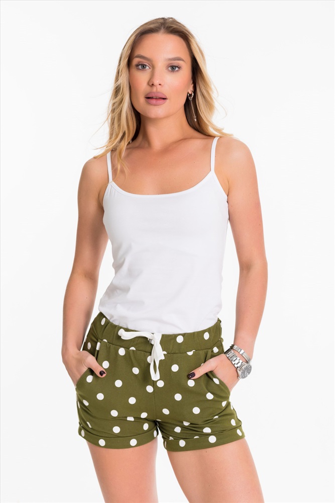 Сезон: Летний Силуэт: Облегающий Состав: Хлопок 95% Лайкра 5% Цвет Номенклатуры: хаки Шорты женские из х/б полотна с лайкрой. Для лучшей посадки по линии талии продёрнут шнур, а сзади в поясе проложена и зафиксирована эластичная резиновая тесьма. По бокам расположены карманы. Низ шорт оформлен отворотами. . Комментарии к товару