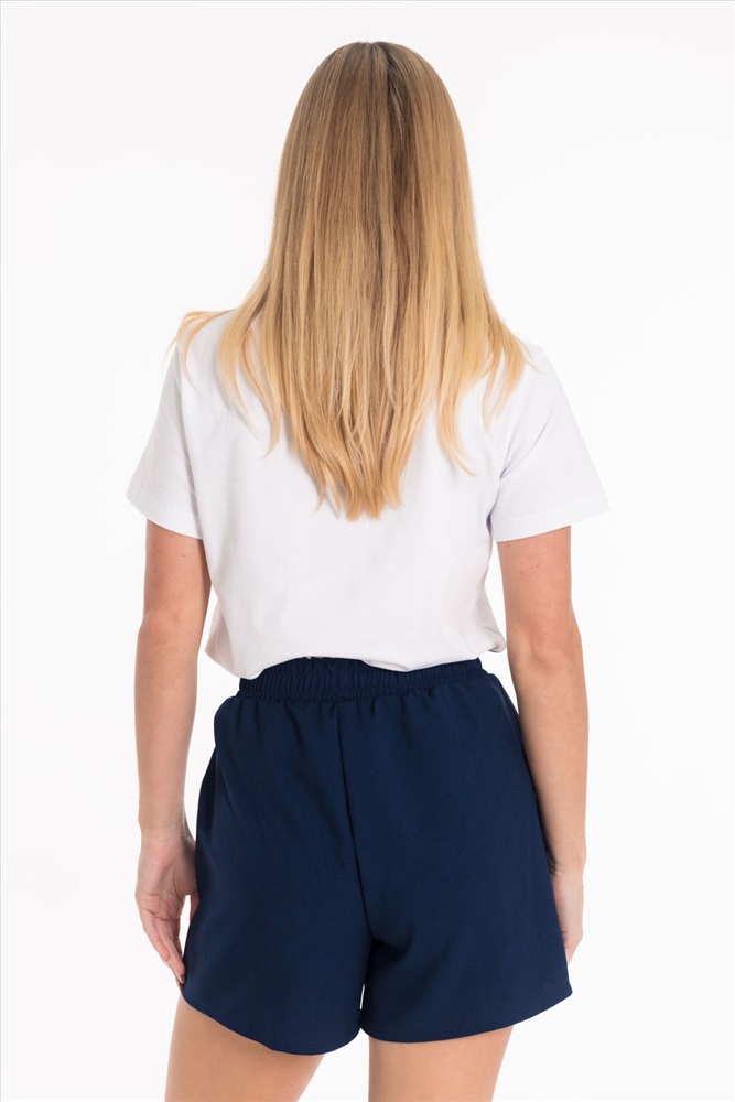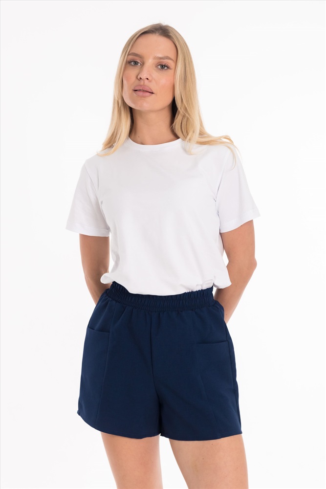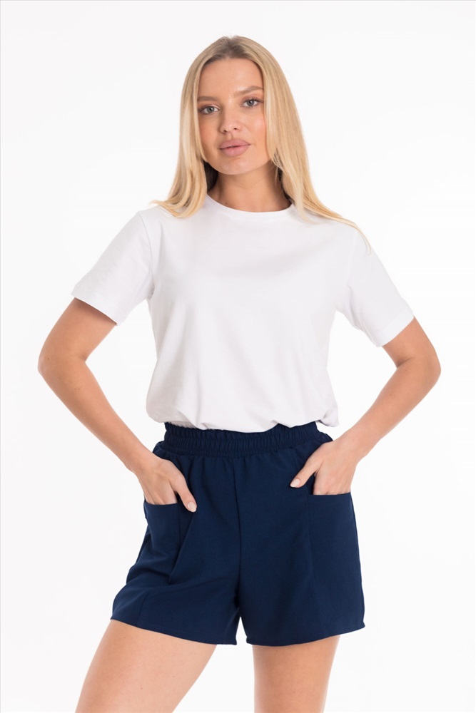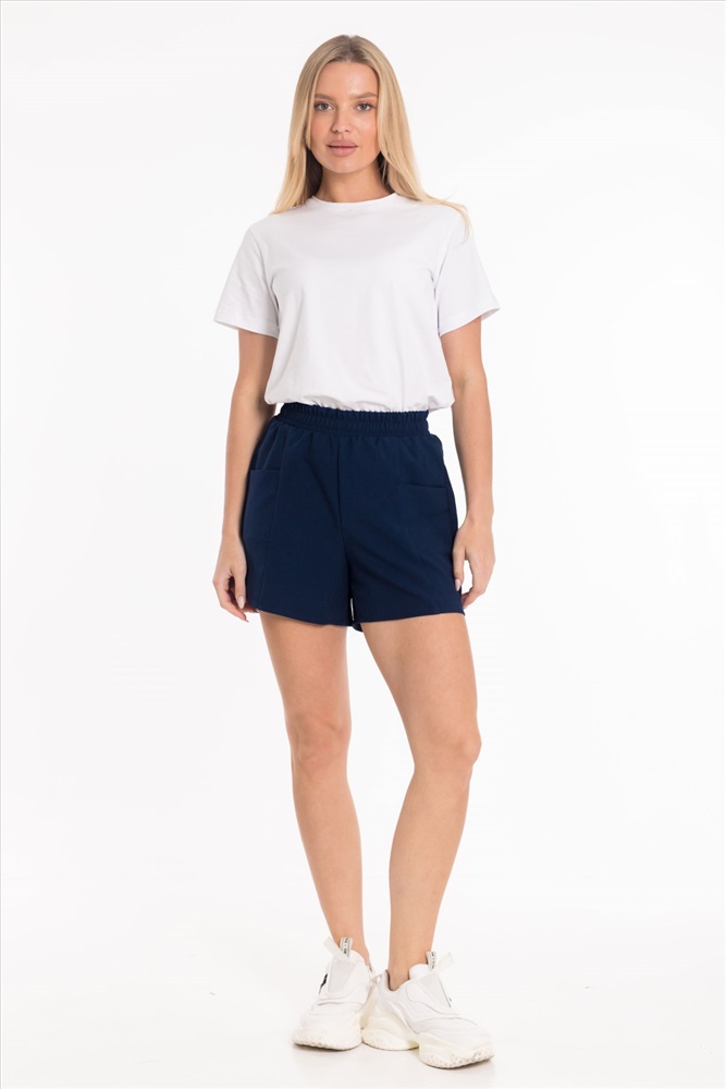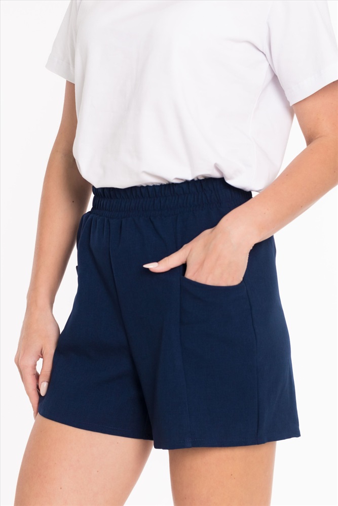 Сезон: Летний Силуэт: Свободный Состав: Полиэстер 100% Цвет Номенклатуры: синий Шорты из полотна "искусственный лен". Пояс на резинке, боковые карманы. Комментарии к товару