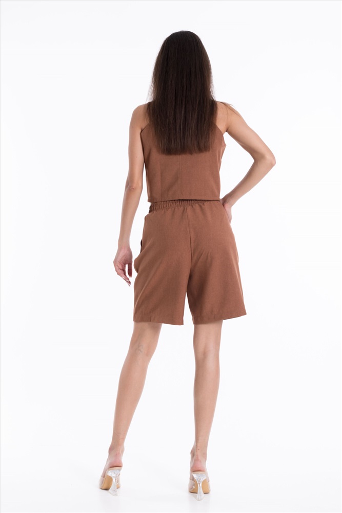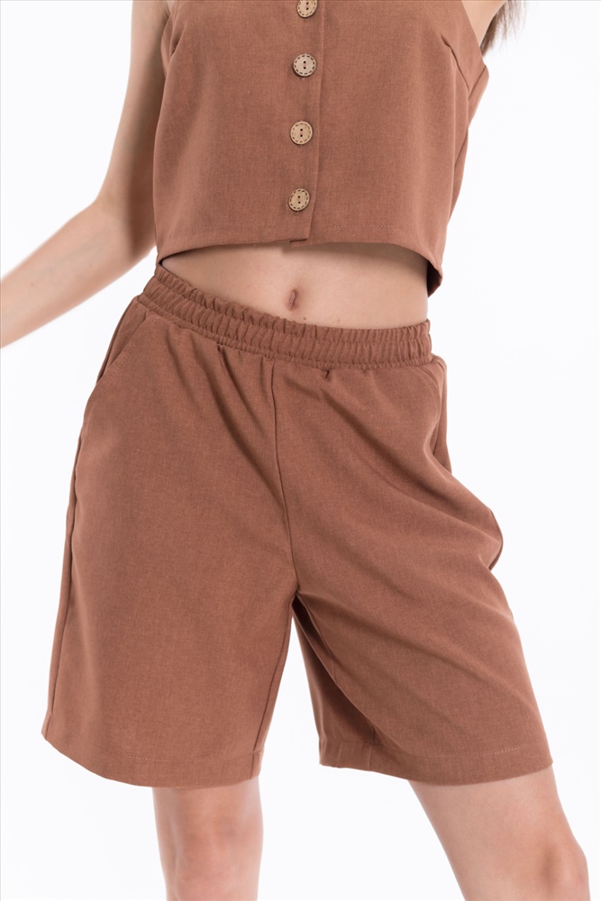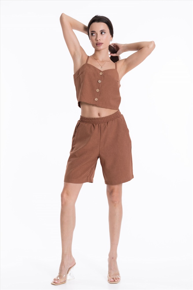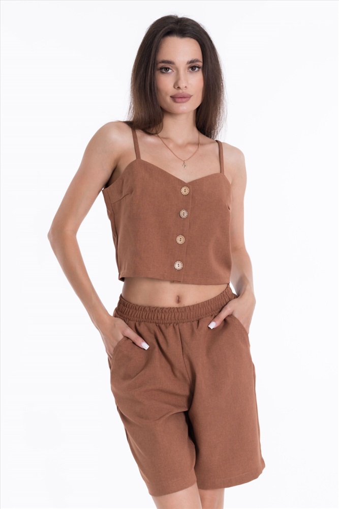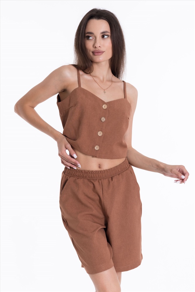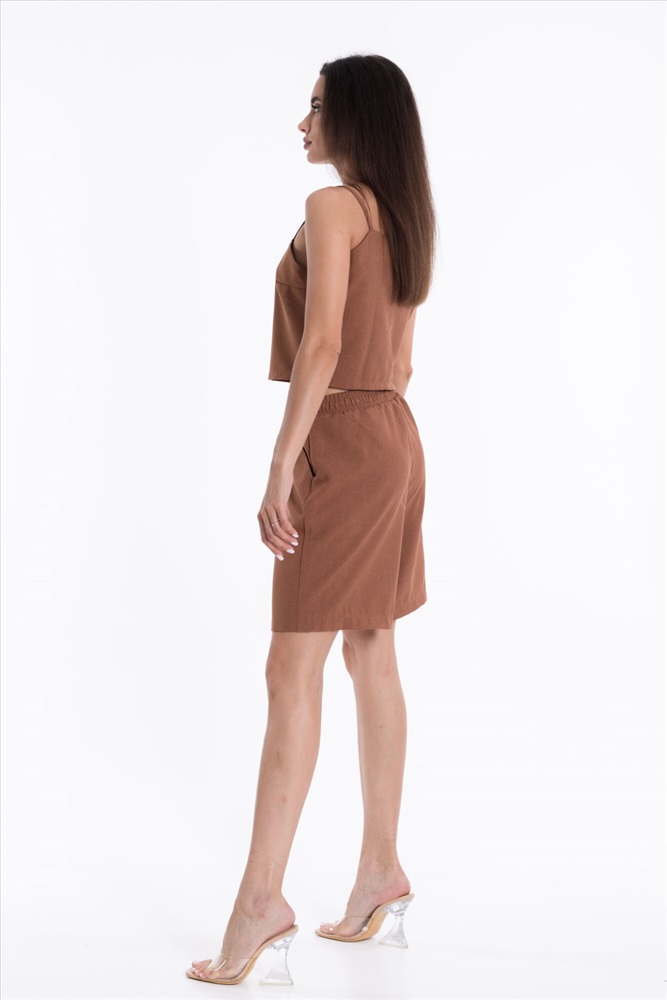 Сезон: Летний Силуэт: Свободный Состав: Полиэстер 100% Цвет Номенклатуры: коричневый Шорты из полотна "искусственный лен". Удлиненные, пояс на резинке, боковые карманы. Комментарии к товару