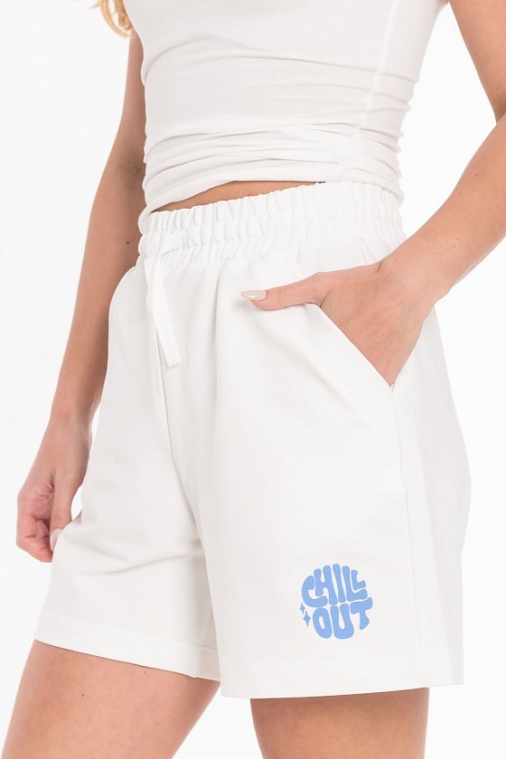 Шорты выполнены из футера двухнитки. Свободный силуэт обеспечивает комфорт, пояс на резинке со шнуром позволяет регулировать посадку. По бокам расположены удобные карманы. Спереди принт, добавляющий образу индивидуальность.