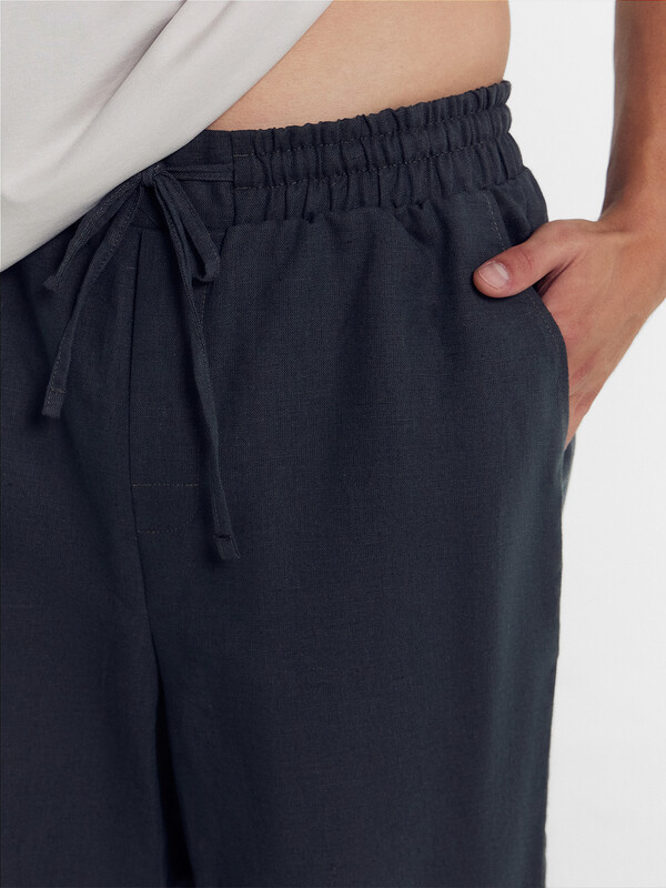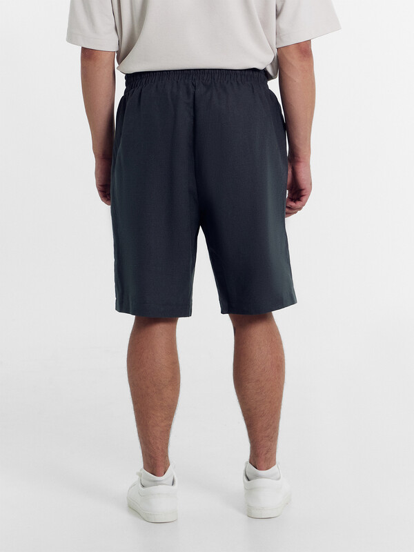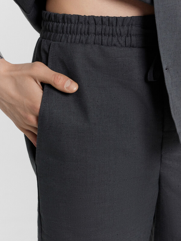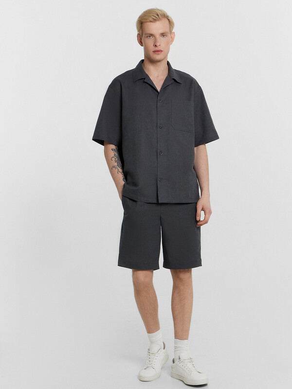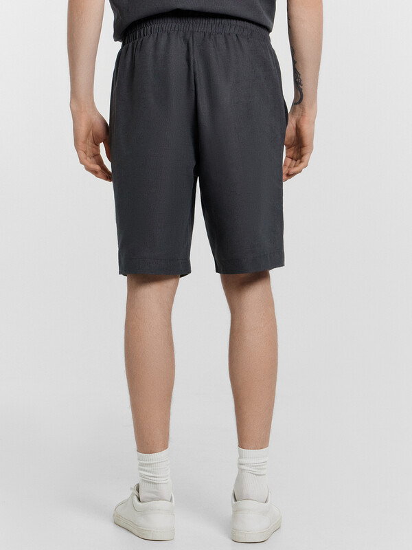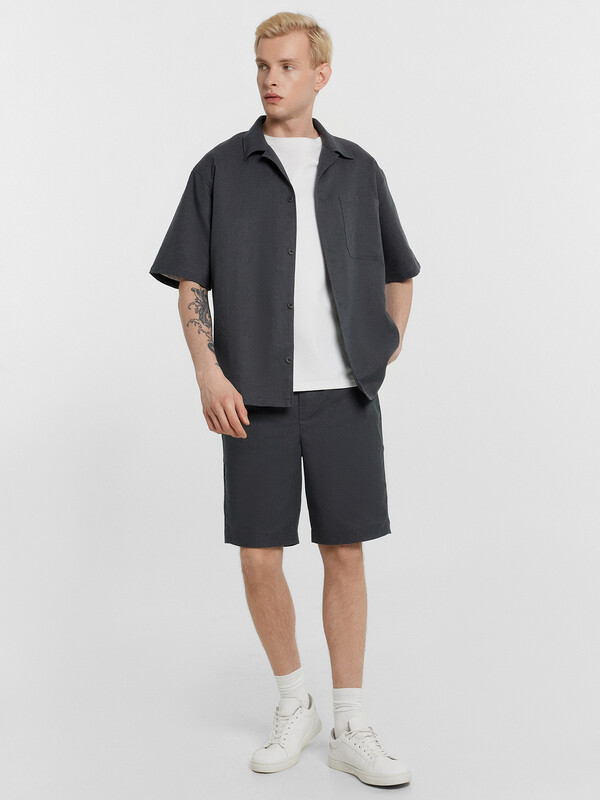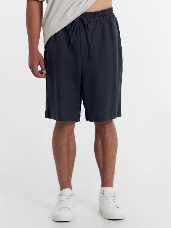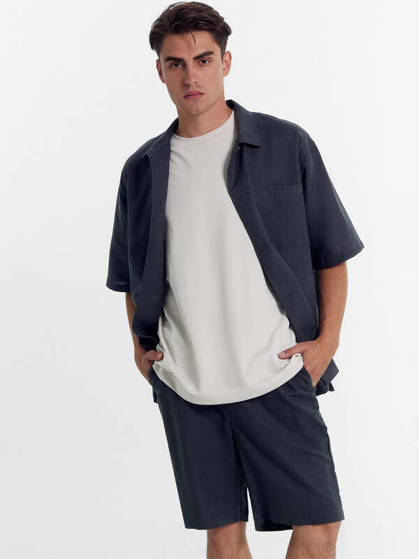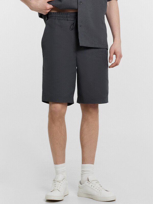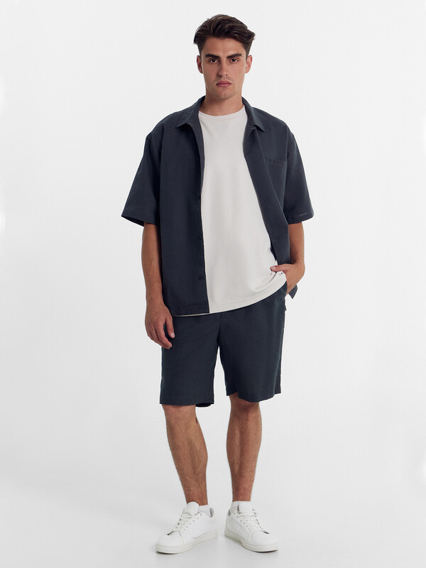 Текстильные шорты с классической линией талии длиной выше колен. Полотно выполнено из натурального хлопка и льна. Пояс отрезной, с регулировочным шнурком в талии. Есть удобные карманы «хулиганы». На передней левой детали проложены отделочные строчки – имитация гульфика. Стильный выбор!