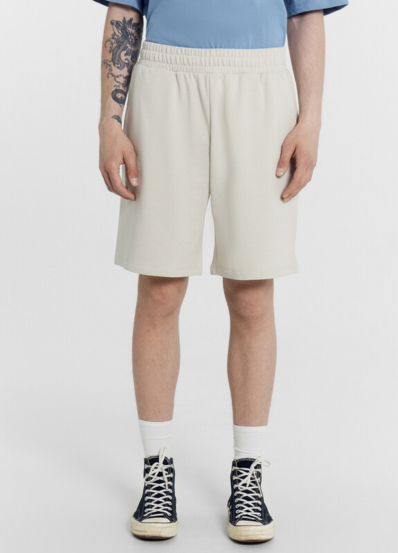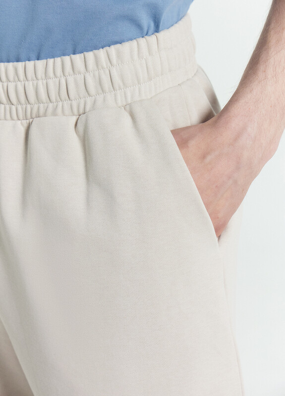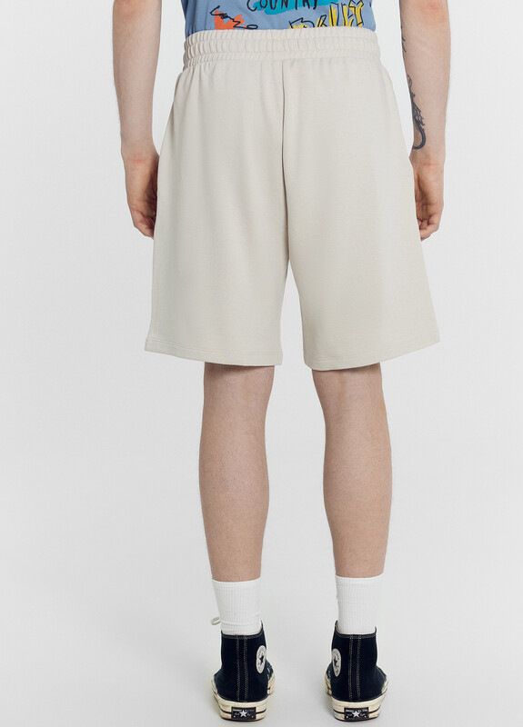 Шорты мужские прямого силуэта из трикотажного полотна футер. Пояс отрезной из основного полотна с эластичной тесьмой внутри. По поясу проложены отделочные строчки. По внутренней части пояса втавлен кругловязаный шнур. В боковых швах обработаны карманы с отрезным бочком, подкладка карманов кулирка.