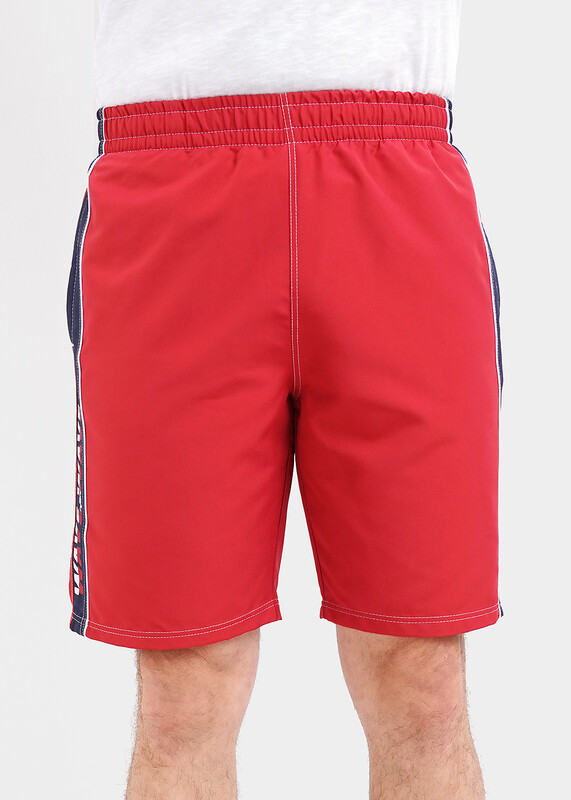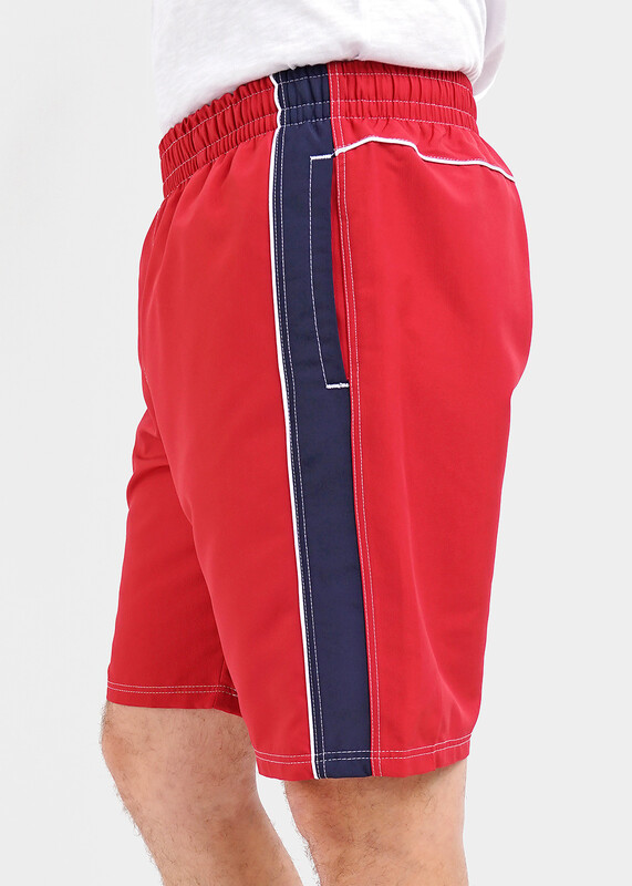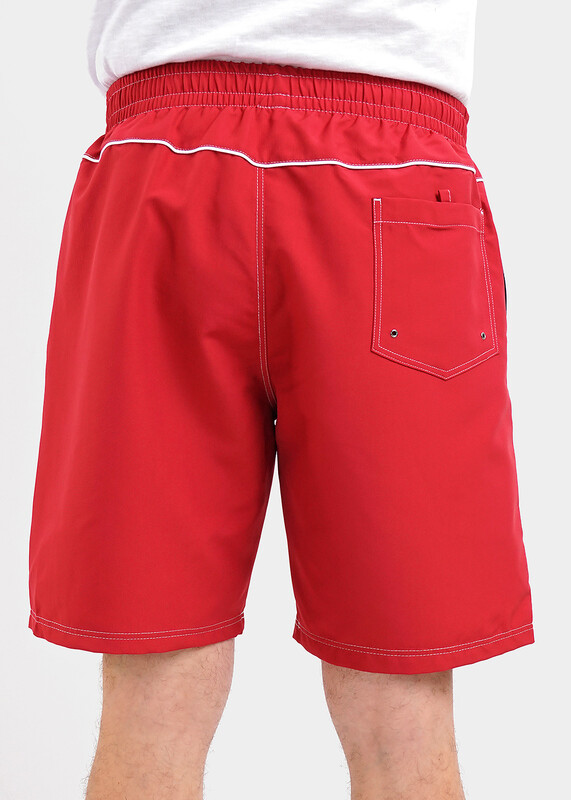 Стильные пляжные шорты комфортной посадки из быстросохнущего полотна. Модель дополнена небольшим принтом и контрастными строчками.