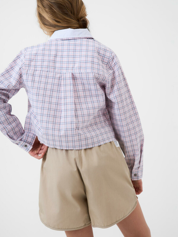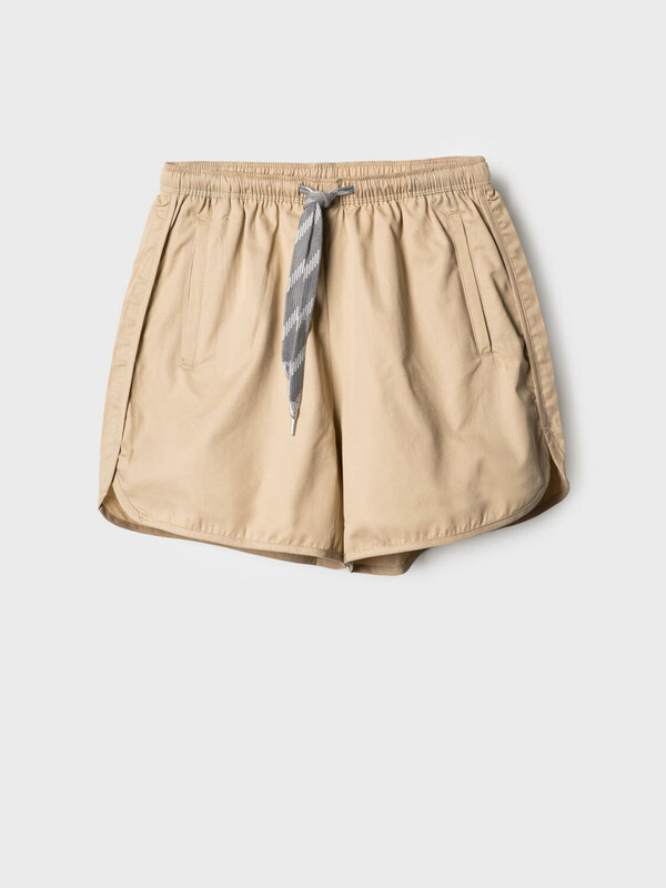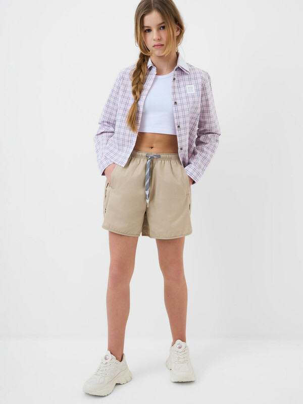 Шорты для девочки подростка. Модель имеет длину мини и комфортную посадку за счёт эластичного пояса и декоративного шнура с узором. По бокам — карманы на молниях. Низ фигурный, с закруглениями. Сзади — небольшая декоративная нашивка. Выполнена из дышащего, хлопкового твилла.