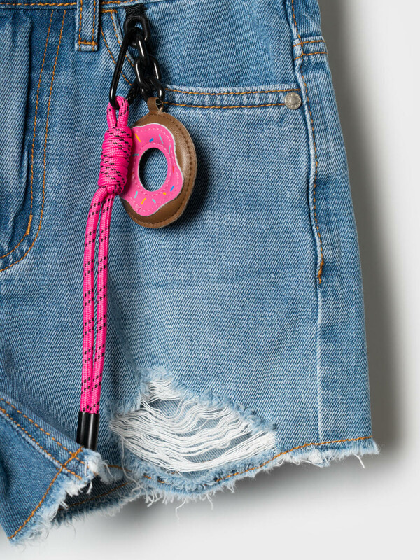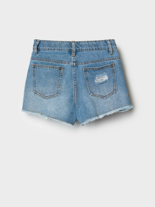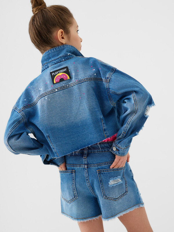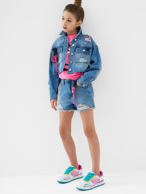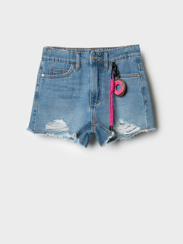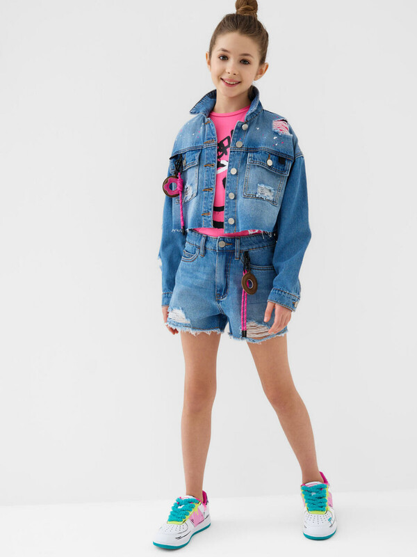 Джинсовые шорты для девочки подростка. Застежка на молнию и болт. На талии — пояс со шлёвками и внутренней резинкой с пуговицей для удобной регулировки. Карманы спереди и сзади. Модель с высокой посадкой и модной укороченной длиной. Края шорт оформлены рваной бахромой, что придаёт изделию стильный и дерзкий вид. В комплекте — съёмная декоративная подвеска с яркой розовой биркой на шнурке.