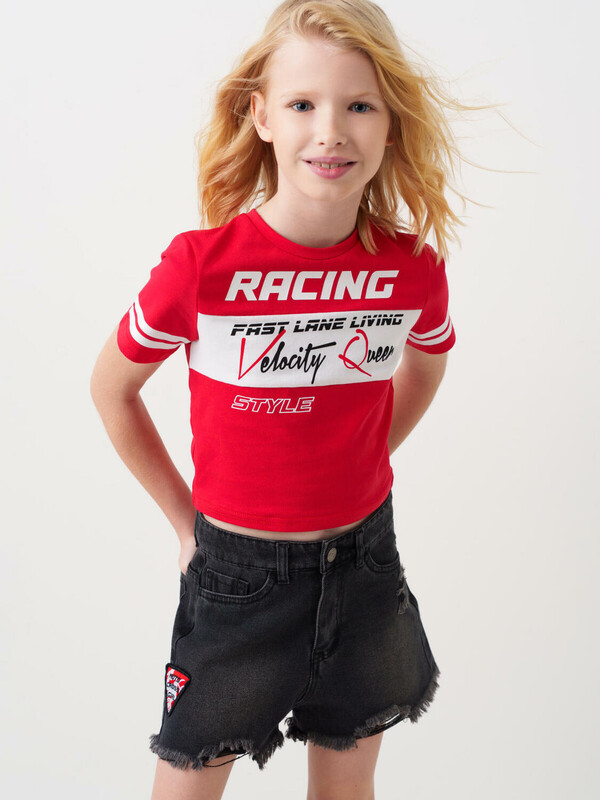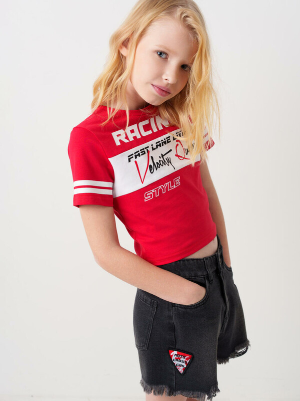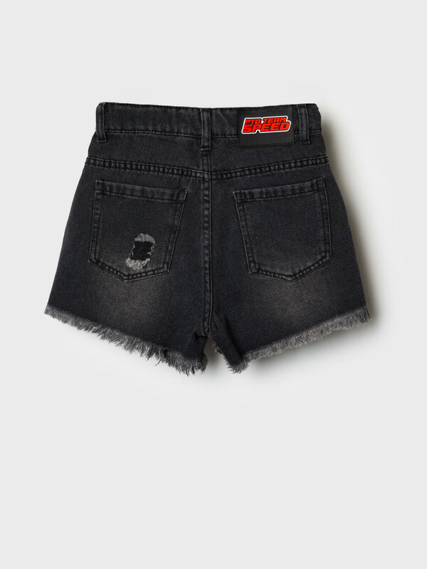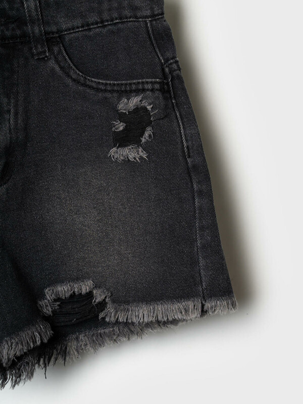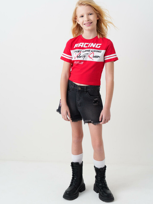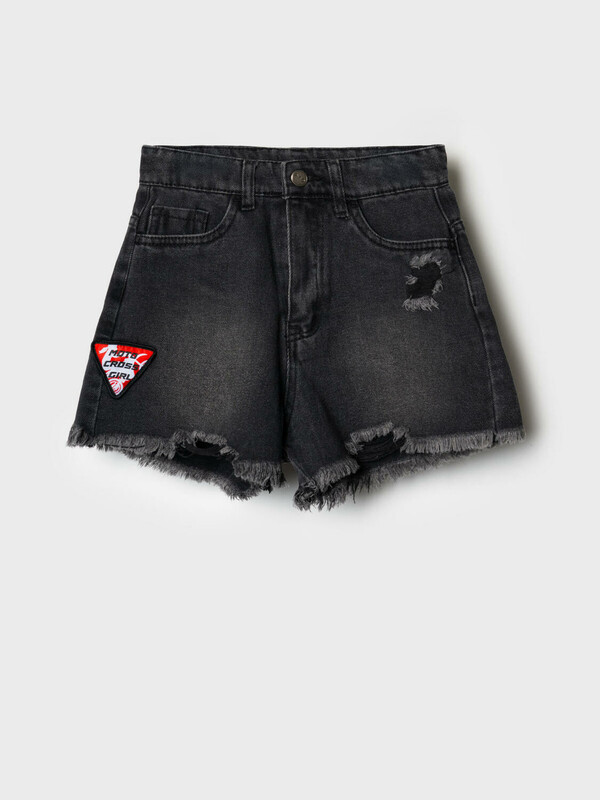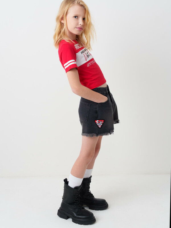 Стильные укороченные джинсовые шорты в байкерском стиле для девочки подростка. Застежка на молнию и пуговицу, а внутри пояса — регулируемая утяжка. Шорты выполнены из плотного чёрного денима с эффектом потёртостей и рваными краями по низу. Спереди — классические карманы и декоративная нашивка, а сзади — накладные карманы и силиконовая нашивка.