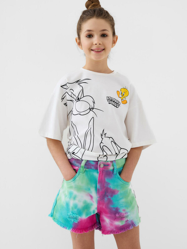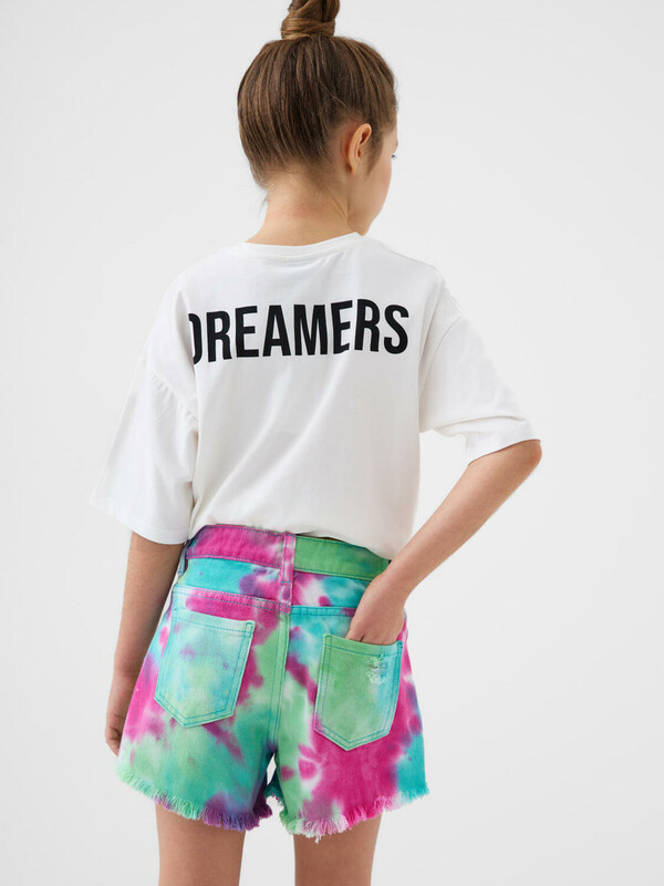 Джинсовые шорты для девочки подростка. Укорочённая модель с удобной посадкой и ярким тай-дай принтом. На поясе шлёвки под ремень, застёжка – на молнию и болт. У шорт два кармана спереди и два накладных сзади. Край штанин оформлен в стиле "рваный низ", создавая лёгкий и модный образ. Выполнены из плотного денима.