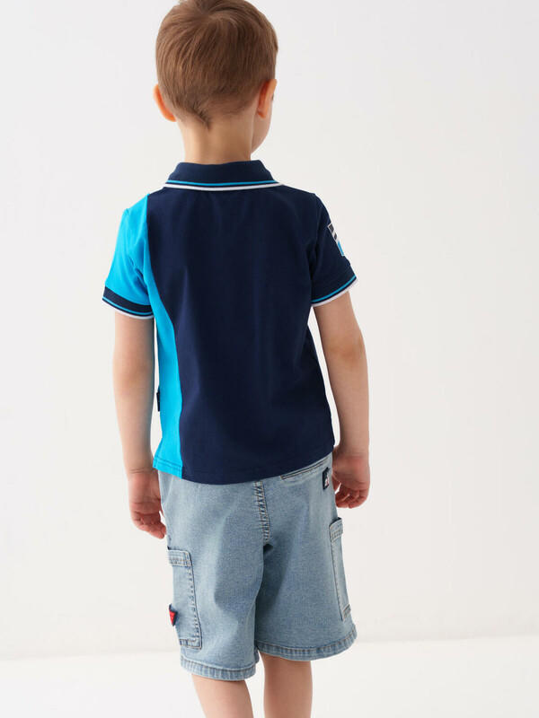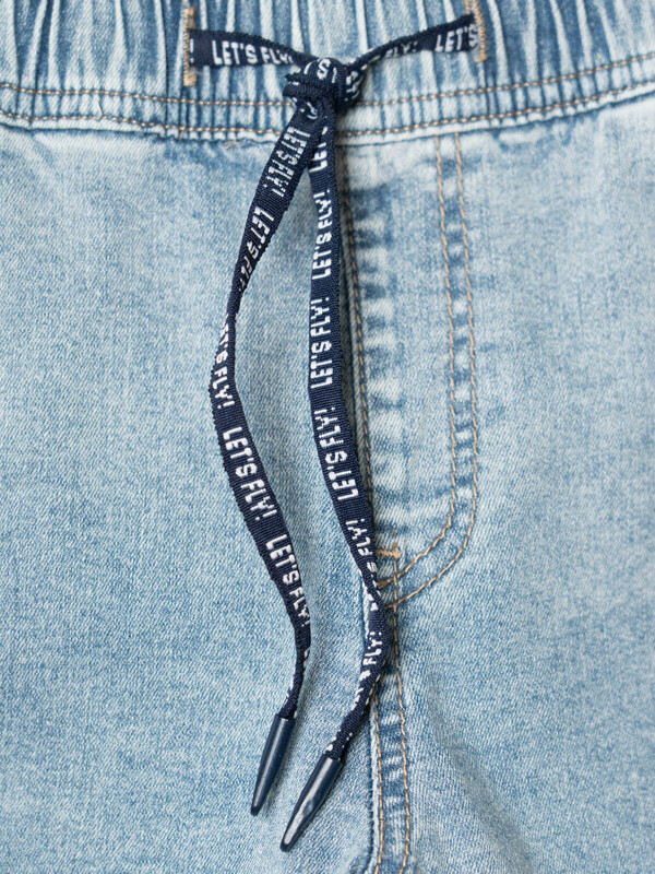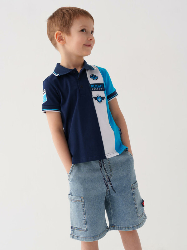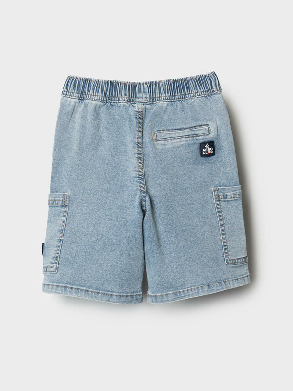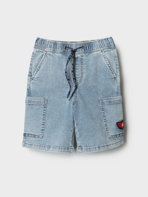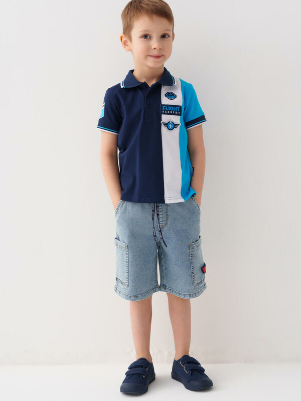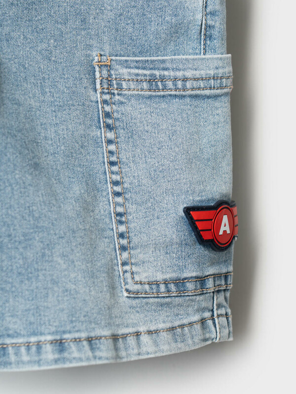 Детские джинсовые шорты свободного кроя для мальчика. Модель выполнена из светло-синего денима и дополнена удобным эластичным поясом со шнурком. Два классических боковых кармана и два накладных кармана-карго по бокам. Задний карман — декоративный.