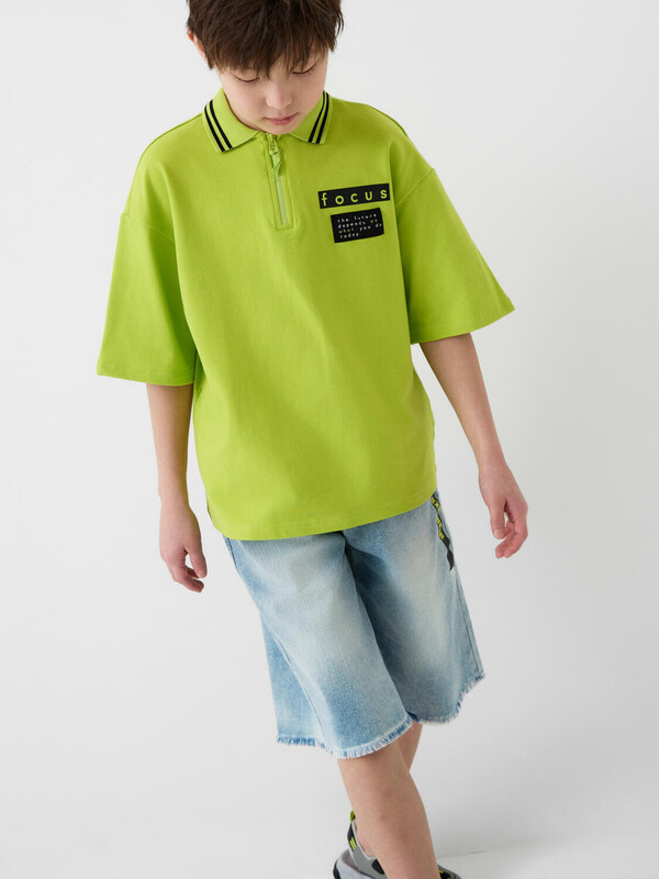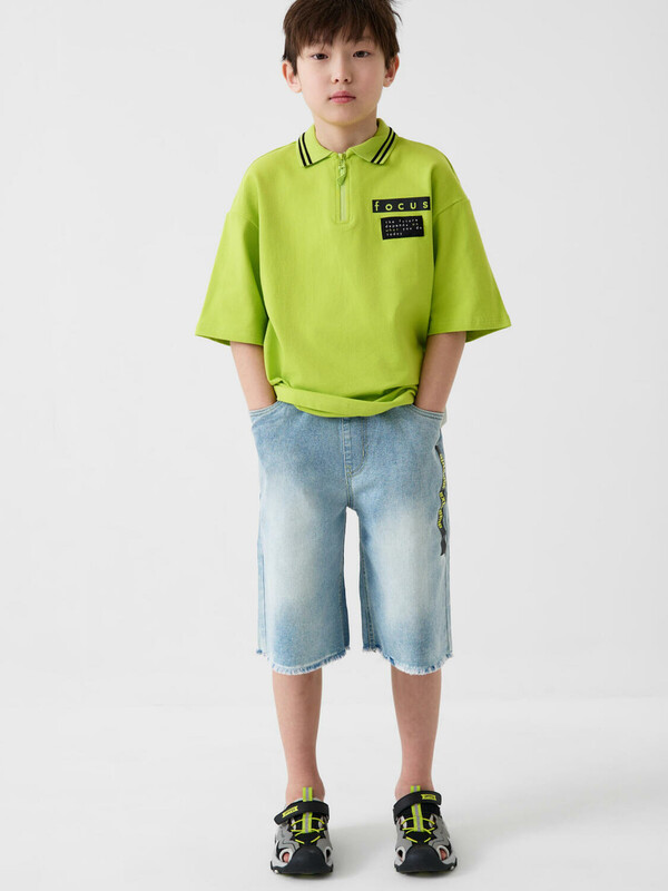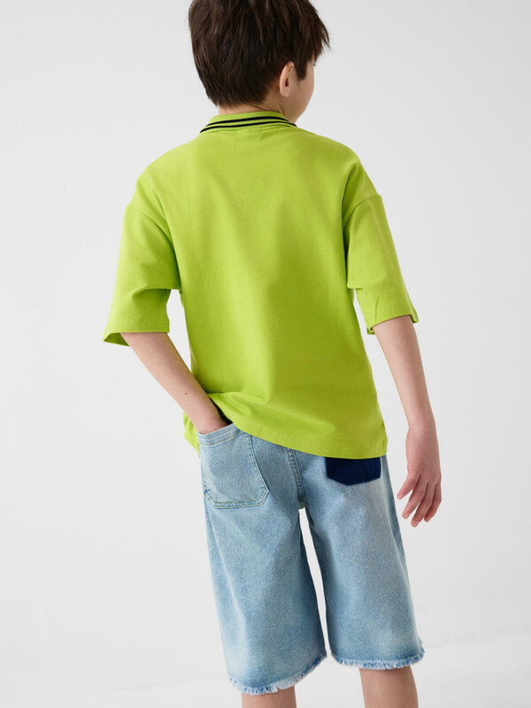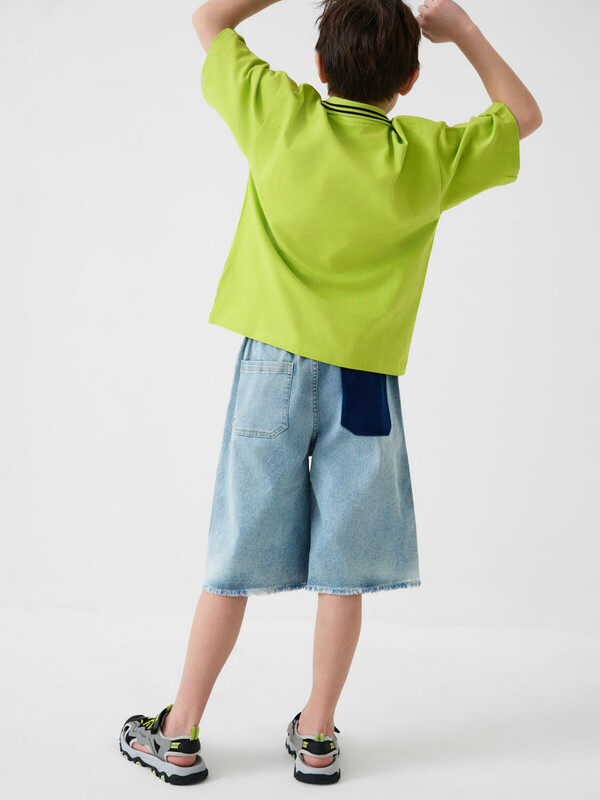 Джинсовые шорты ниже колена для мальчика подростка. Выполнены из варёного светло-синего денима. На поясе — мягкая резинка и шнур для удобной регулировки. Спереди два кармана, сзади — один накладной. Край шорт оставлен необработанным, с декоративной бахромой.