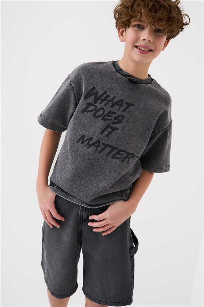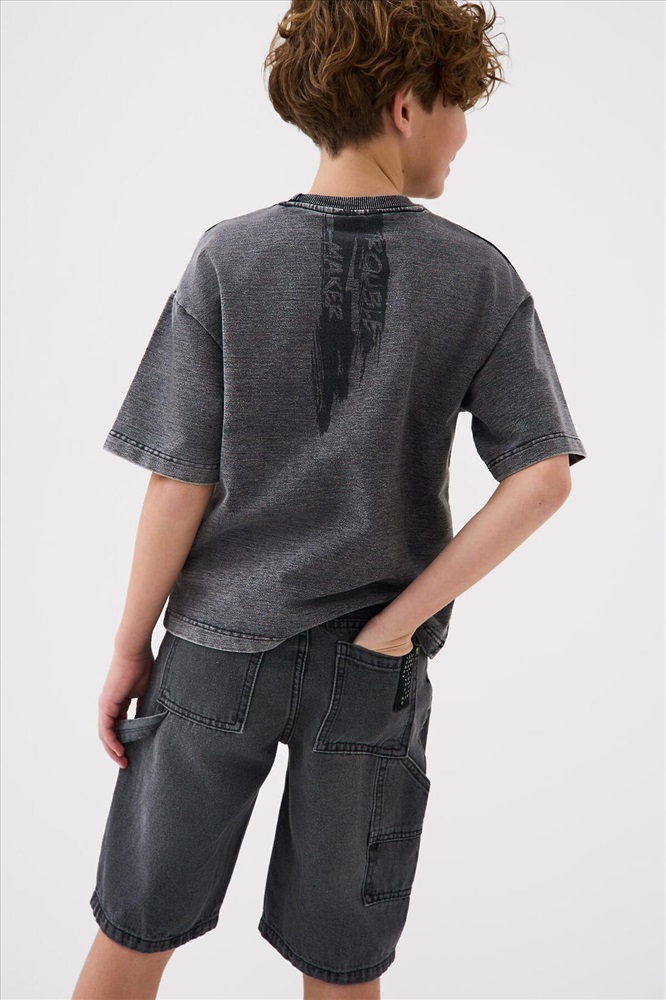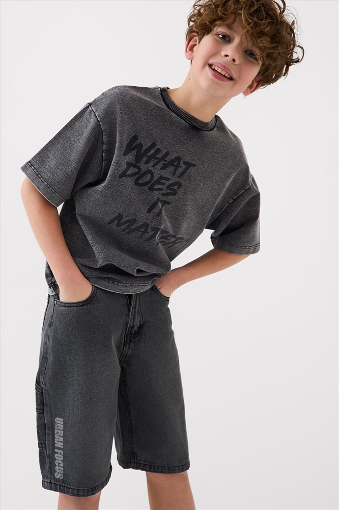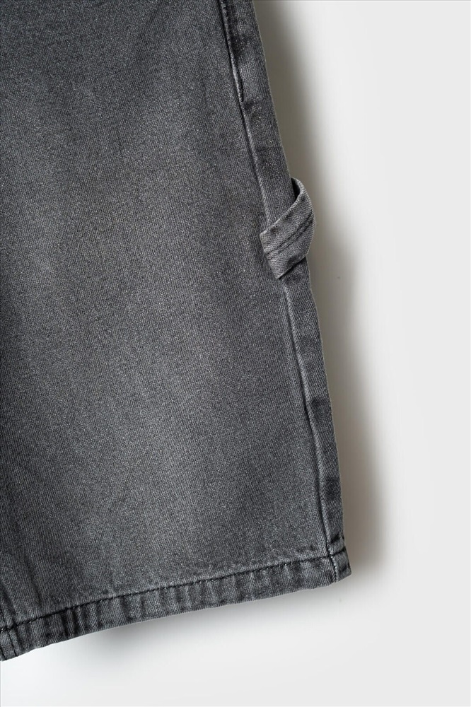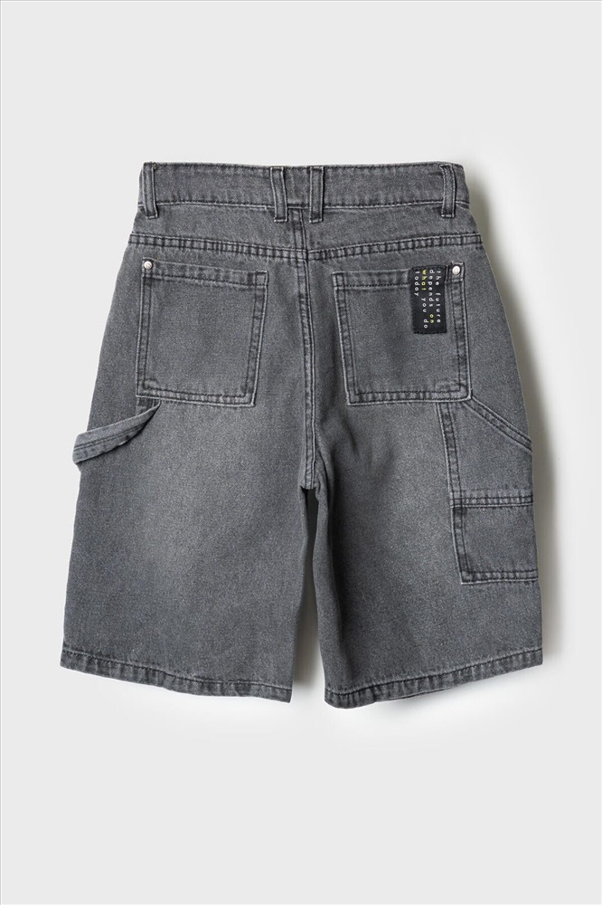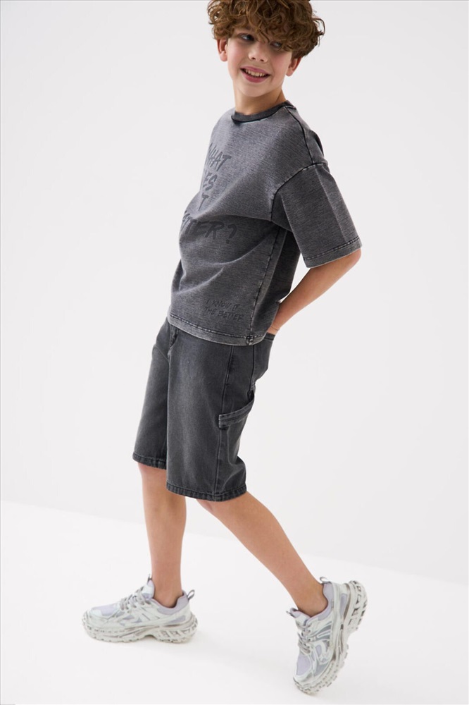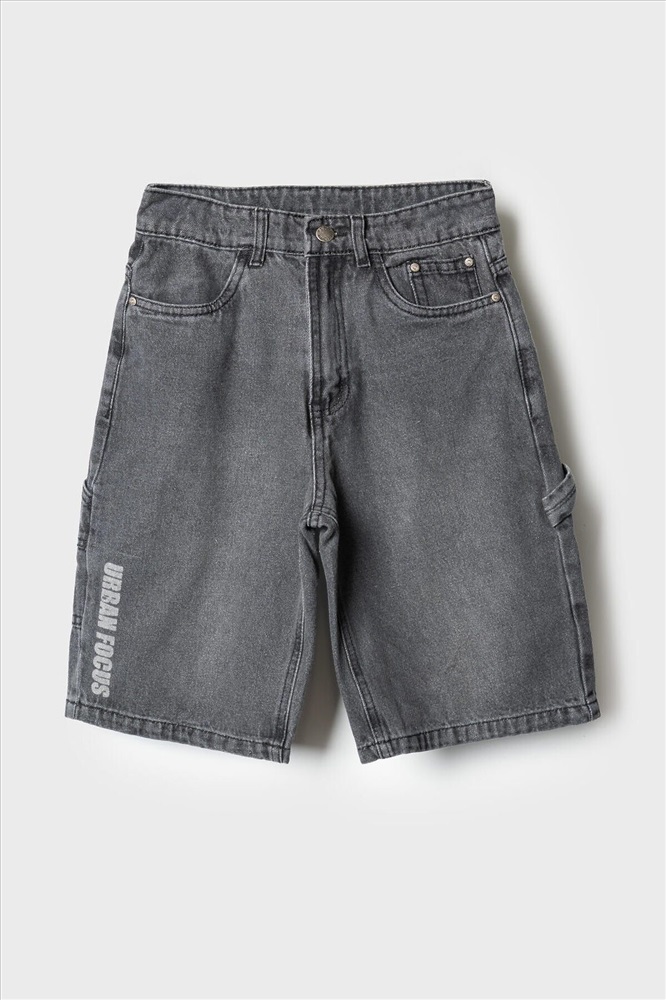 Джинсовые шорты свободного кроя, ниже колена для мальчика подростка. Они выполнены из плотного денима и дополнены множеством практичных деталей: классические передние карманы, задние накладные карманы и дополнительный карго-карман сбоку. Пояс регулируется при помощи внутренней резинки с пуговицей, а в качестве застёжки используется болт и молния. Шорты смотрятся современно и удобно сидят за счёт прямого силуэта и проработанных деталей.