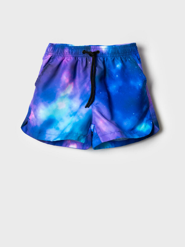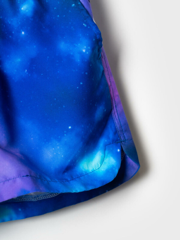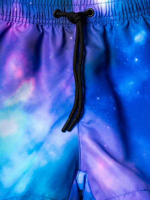 Плавательные шорты для девочки подростка. Шорты средней длины, выполнены из легкого, быстросохнущего материала с ярким космическим принтом. Удобный эластичный пояс дополнен шнуром для регулировки. Внутри предусмотрена мягкая сетчатая подкладка.